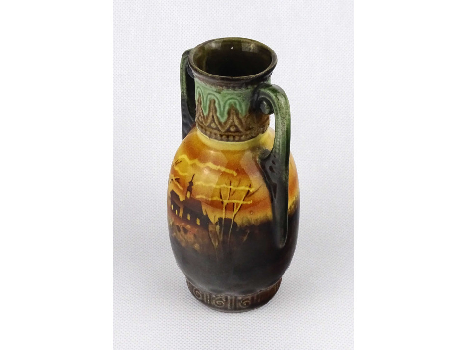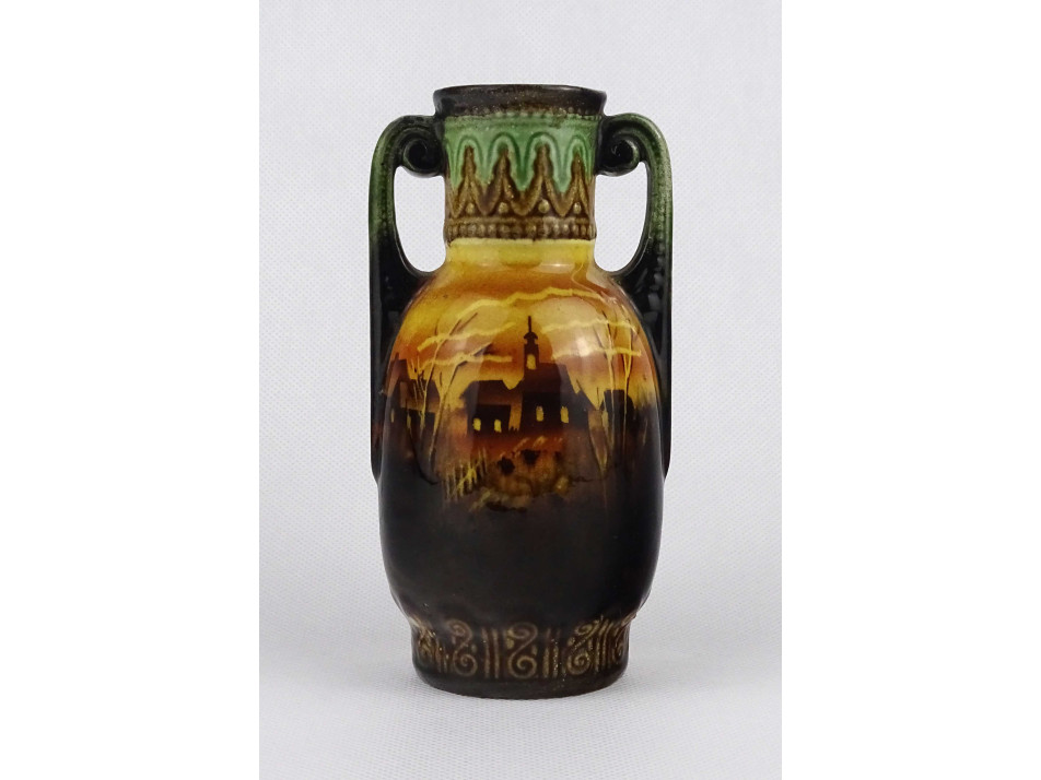 Antik, hibátlan állapotú, zöld és barna színű, tájképpel díszített, szecessziós sítílusú, majolikából készült amfóra váza, díszváza.