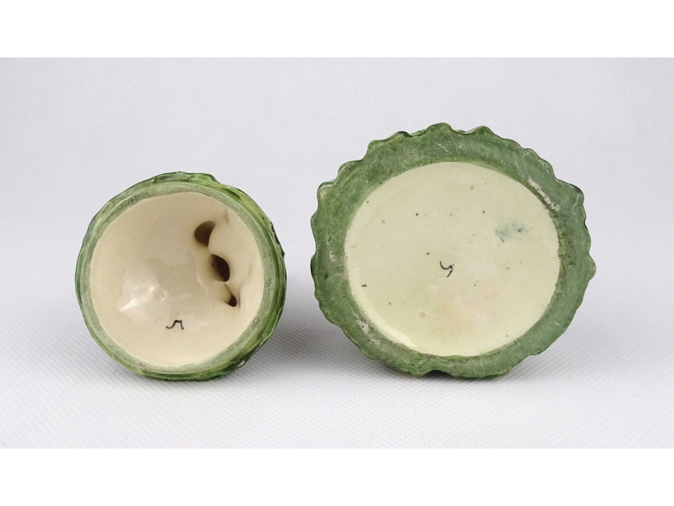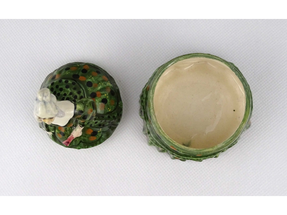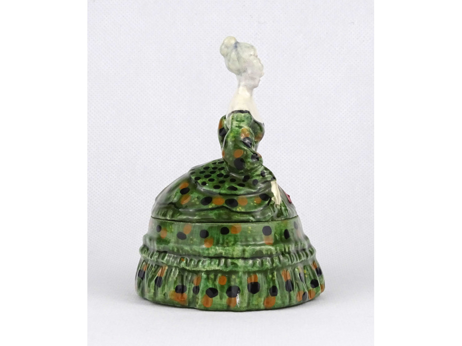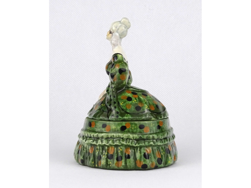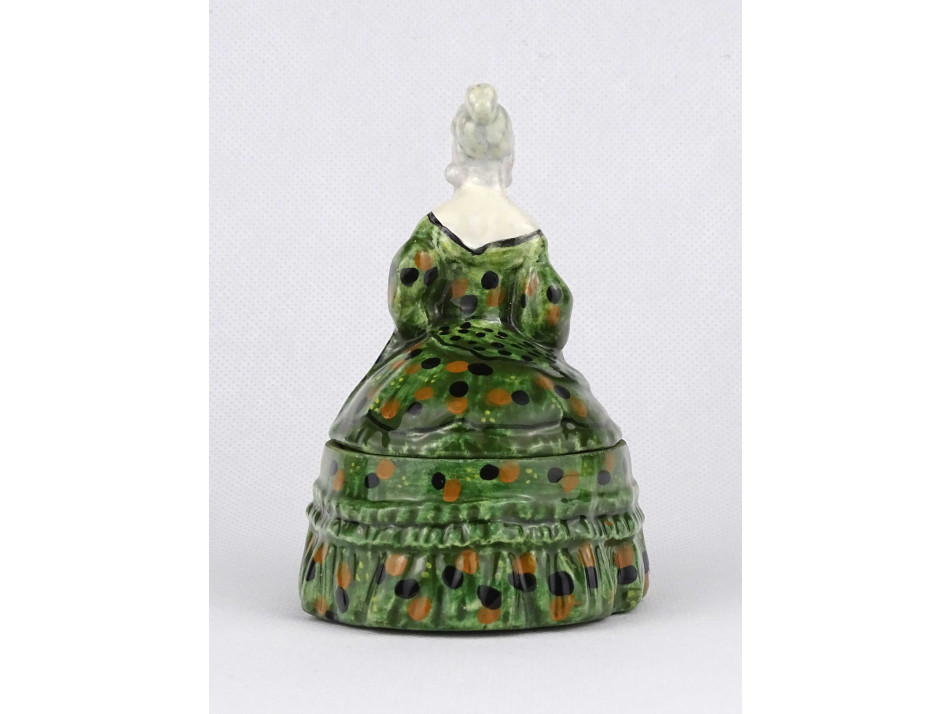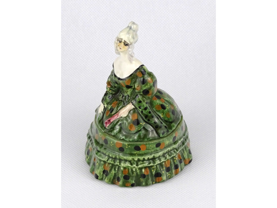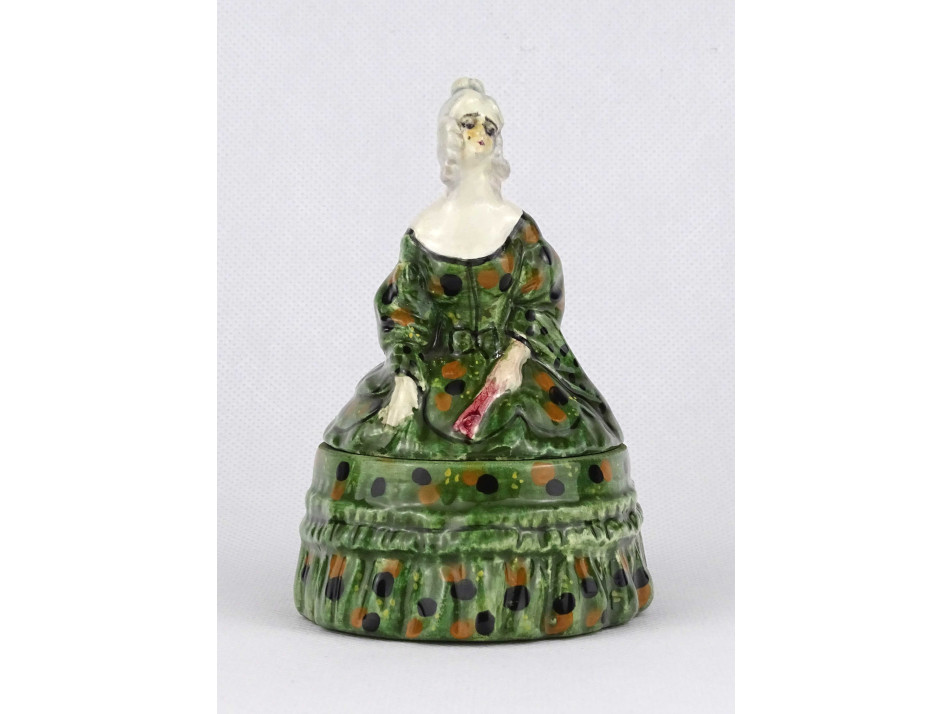 Antik előkelő hölgyet formáló, figurális majolika fedeles bonbonier 11.5 cm