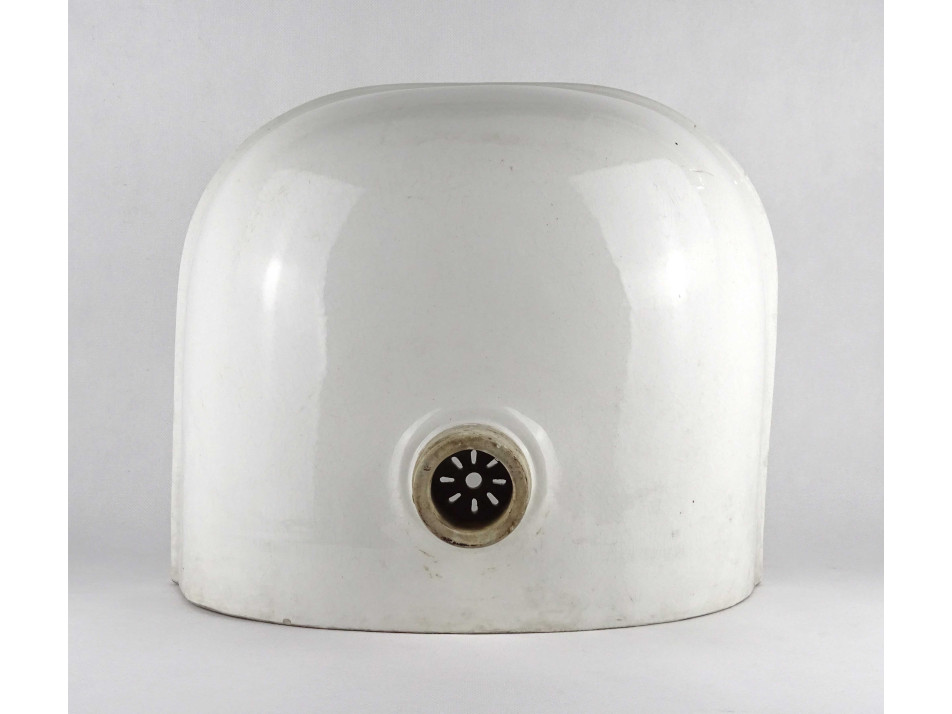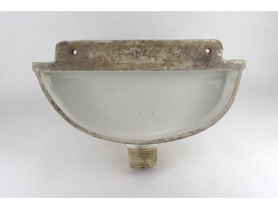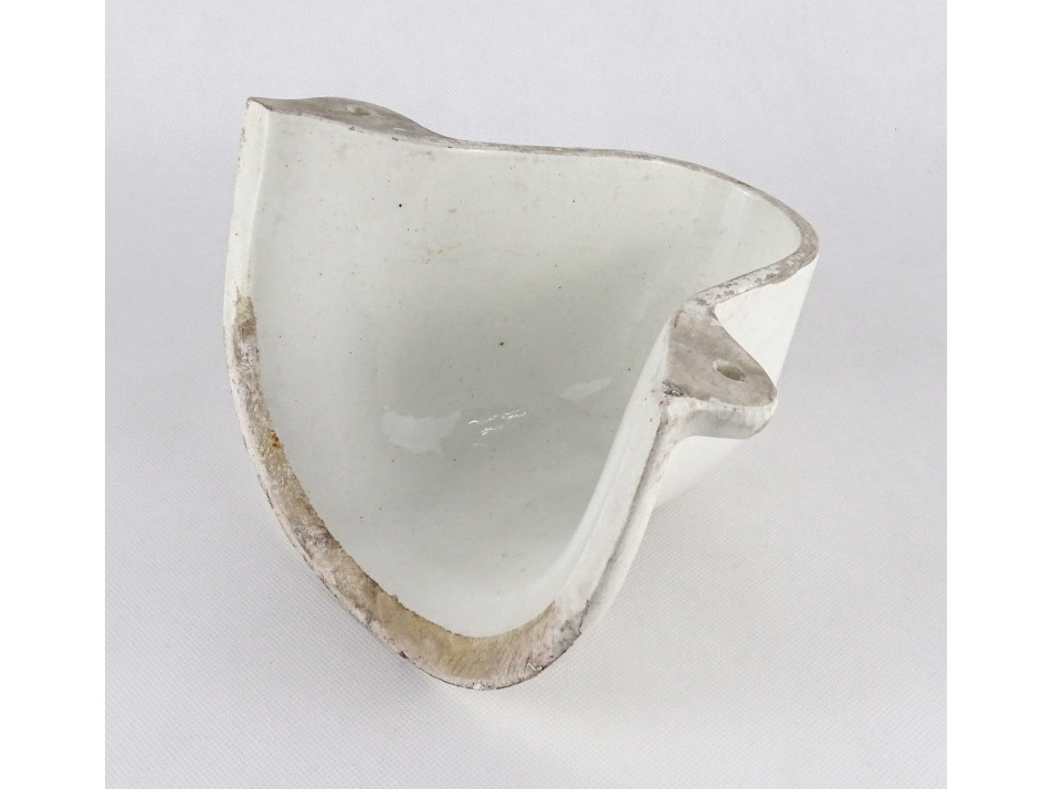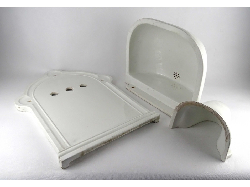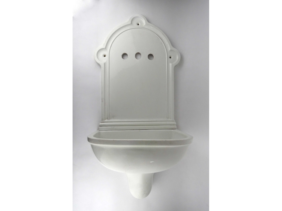 Antik, szép állapotú, jelzetlen, falra szerelhető, komplett, három részből álló majolika falikút, mosdó. A lefolyó rácsánál egy apró lepattanás látható.