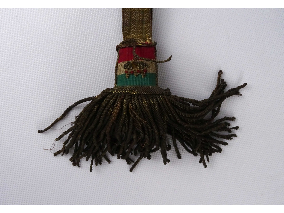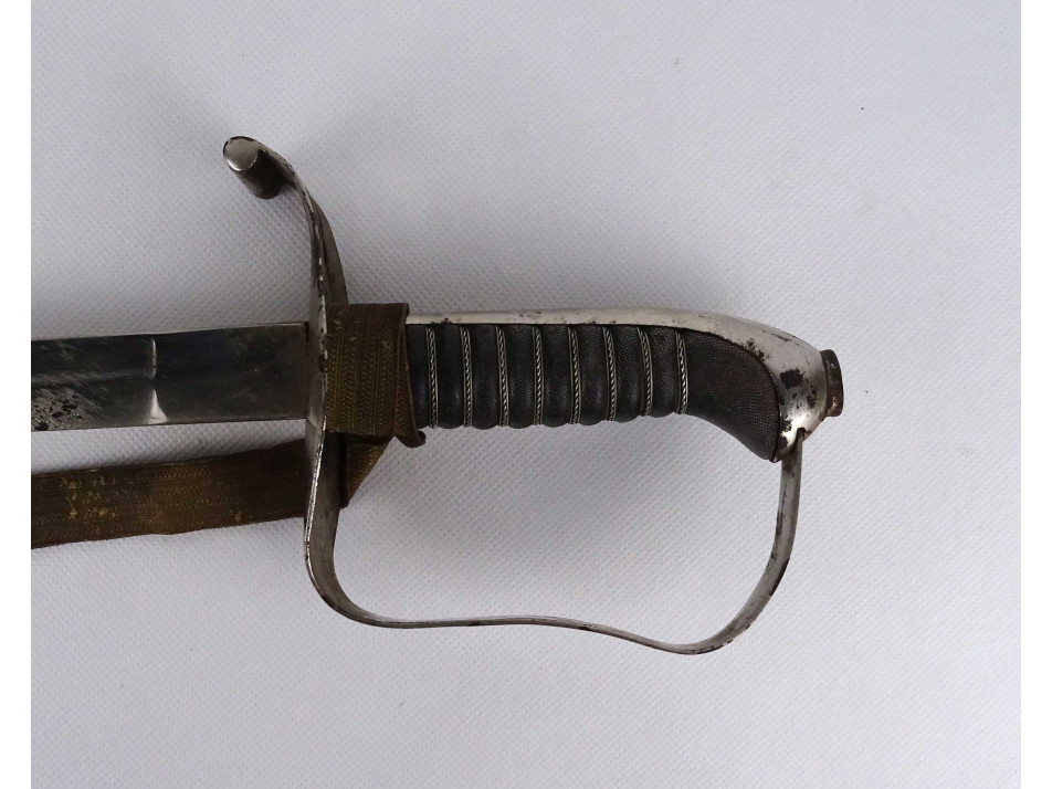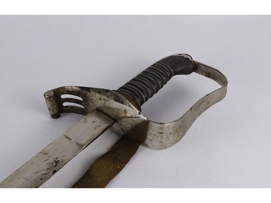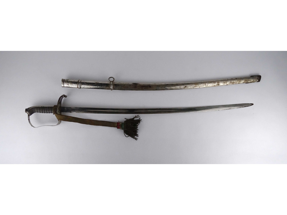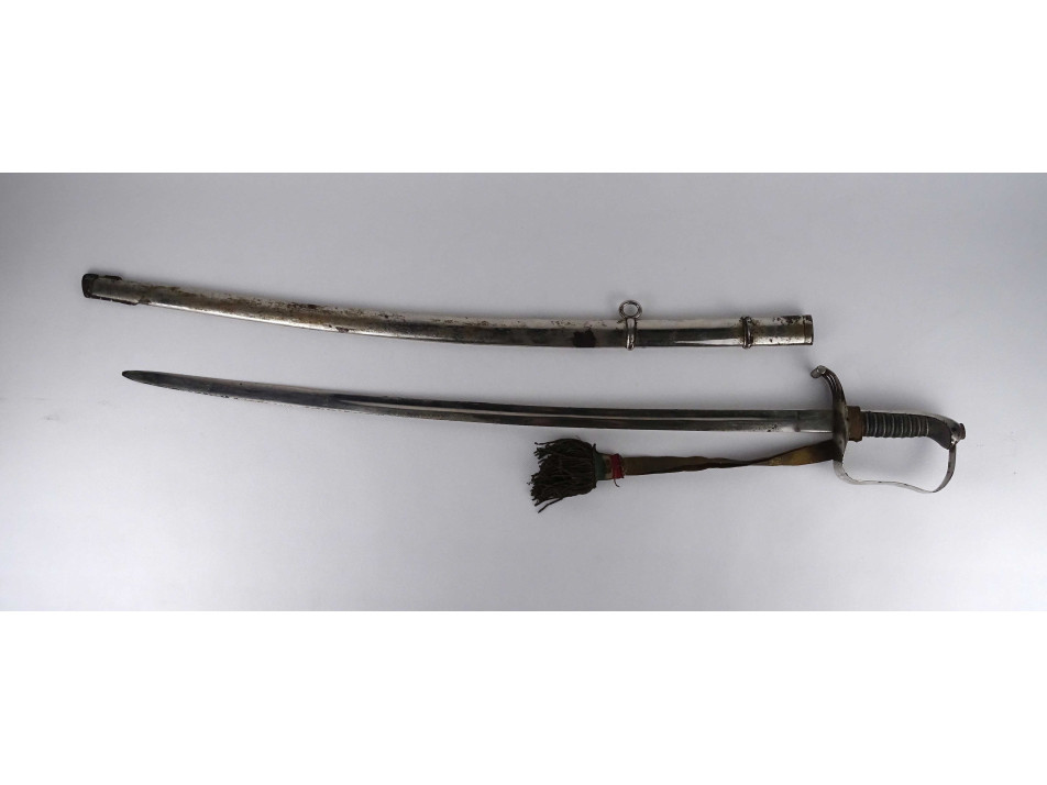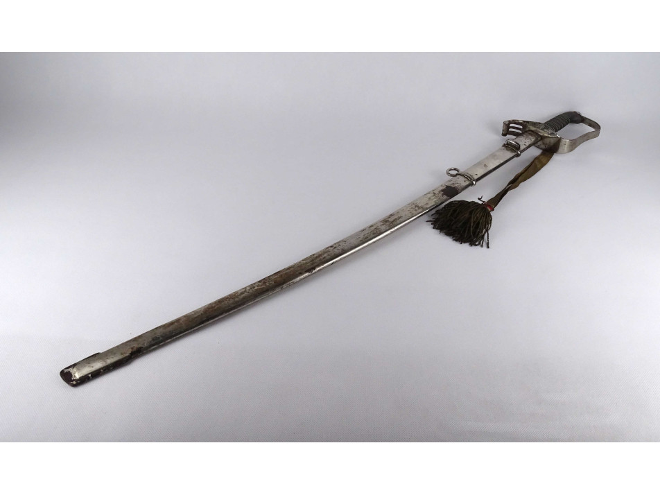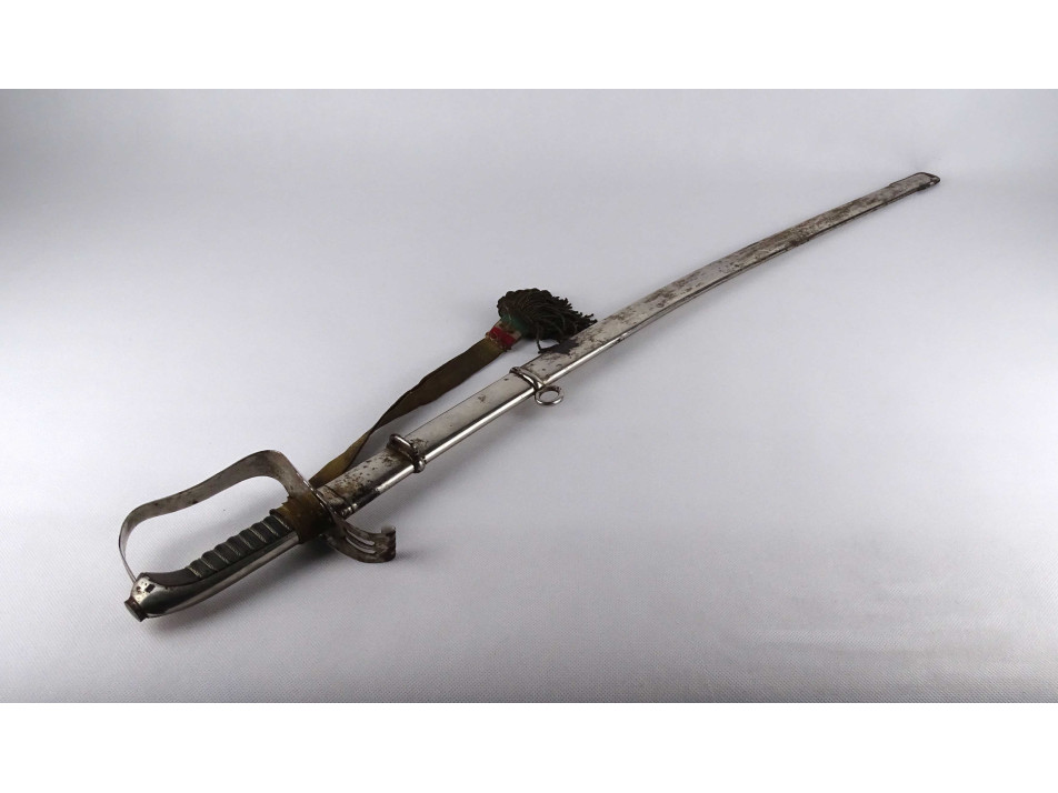 Régi, két háború közötti, Horty korszakbeli szalonkard, ruha kard, 1861M (mintájú) gyalogostiszti szablya hozzátartozó hüvellyel és kardbojttal. A penge és a hüvely jelzetlen, mindkettő krómozása kopottas, néhol hiányos.