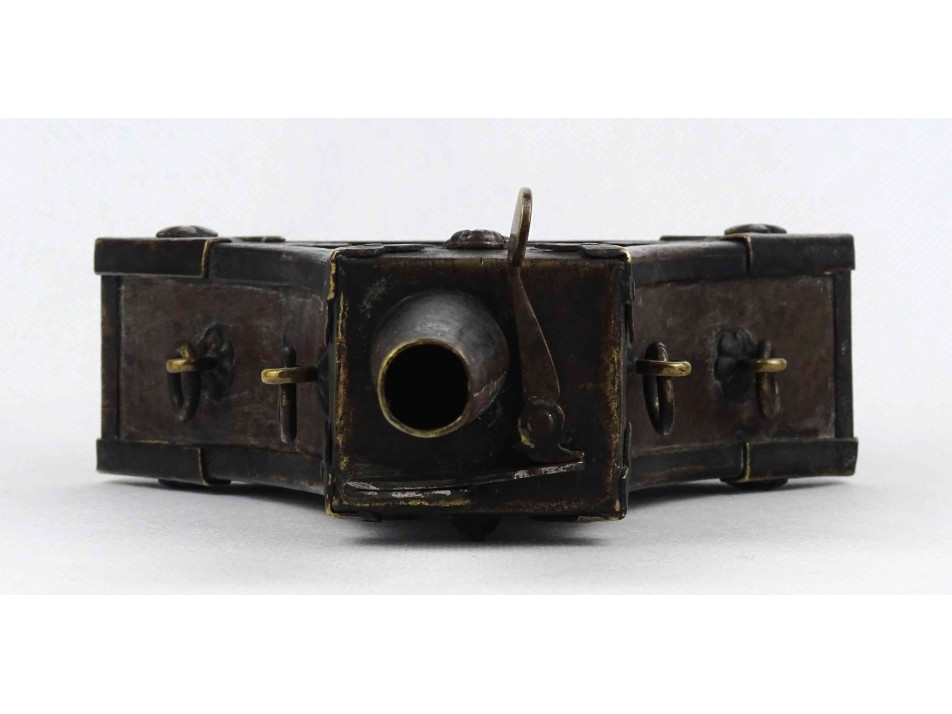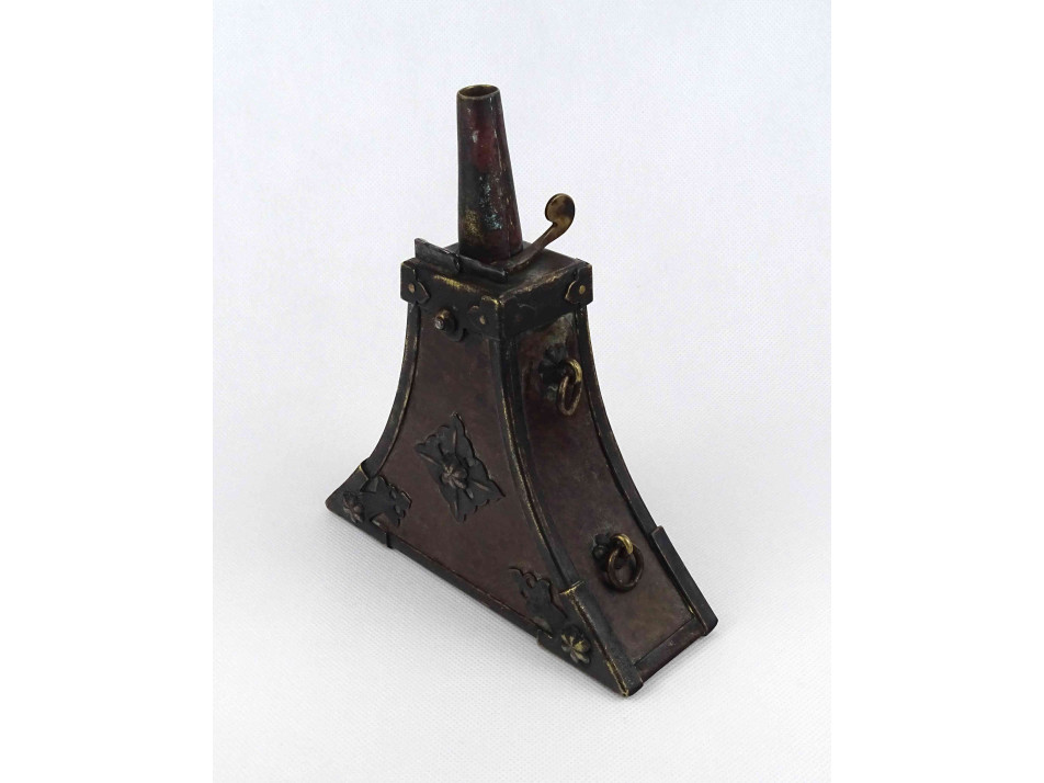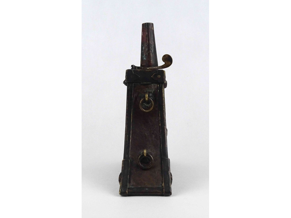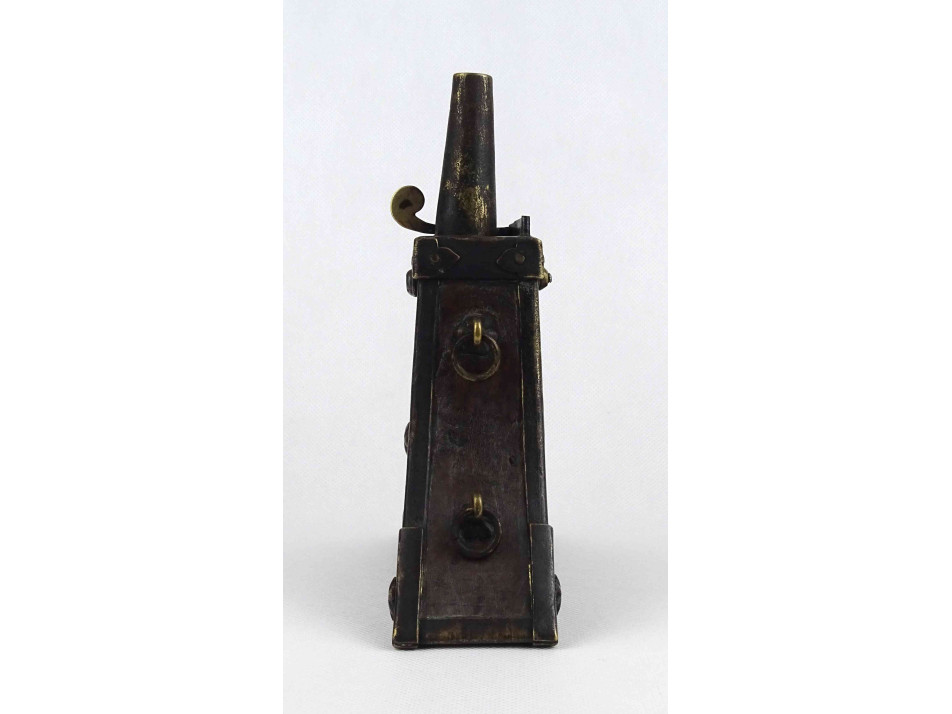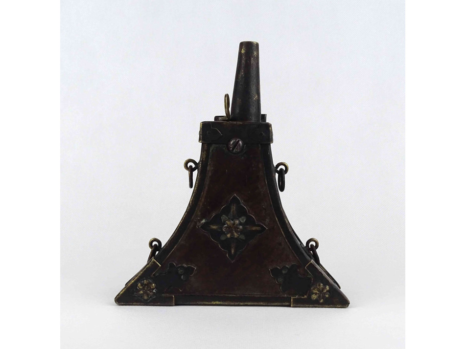 Antik, fából készült bőr bevonatú, réz pántokkal megerősített, veretekkel díszített lőportartó. Lőporos, elöltöltős fegyverekhez használt felporzó, szép állapotban az 1800-as évekből.