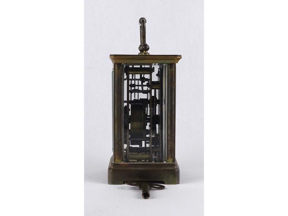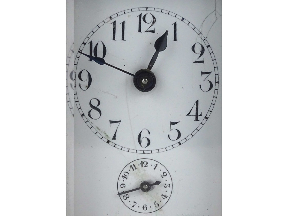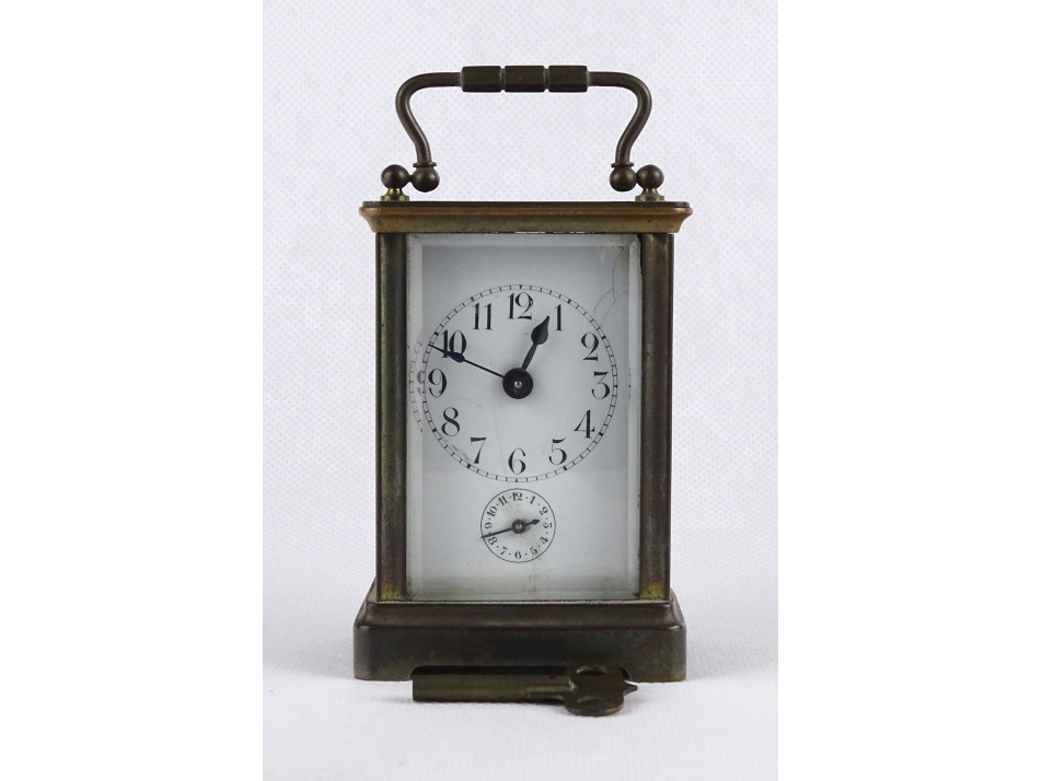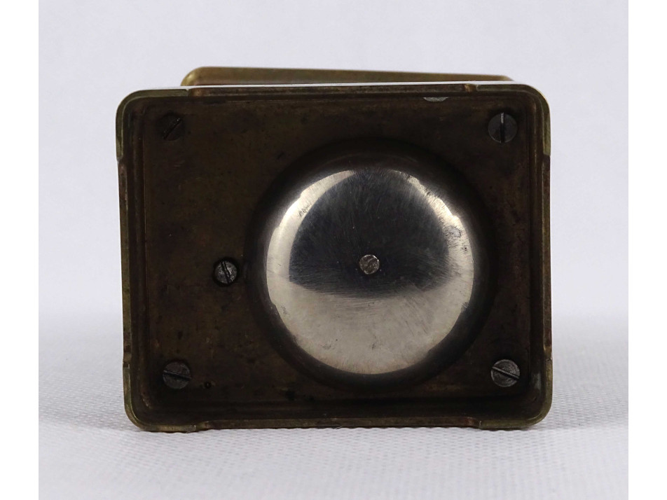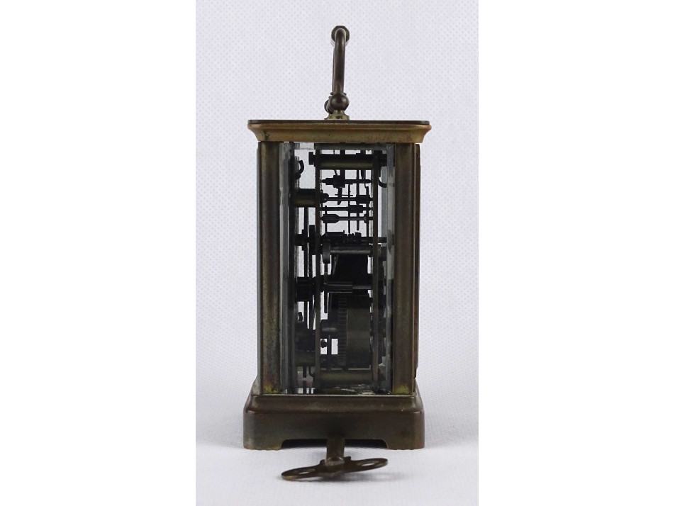 Antik, kisméretű, füllel rendelkező, réz házas utazó óra, körben metszett üvegbetétekkel. Alján csengő, szerkezete ébresztős. Eredeti felhúzókulcsa is megvan. Az óraszerkezet jár, az ébresztő szerkezet működik.
