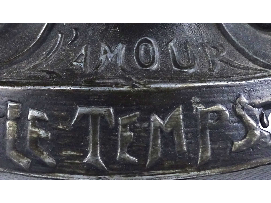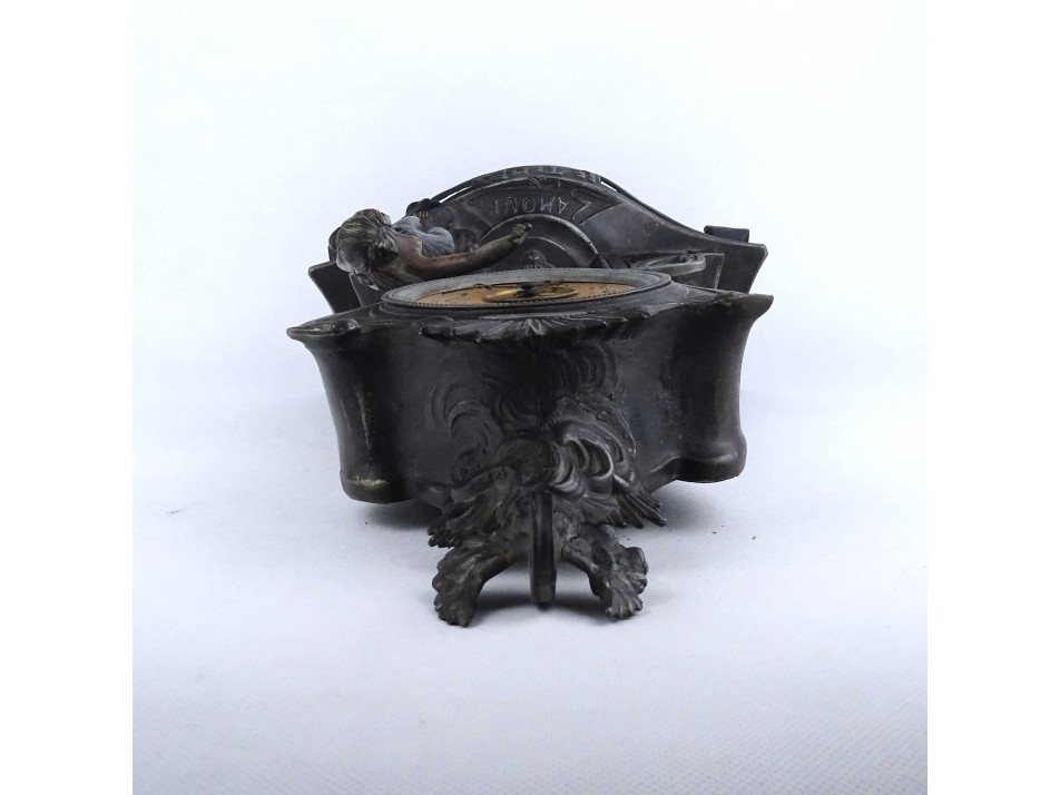 Antik, részben bronzírozott, ón szecessziós kandallóóra. Rajta gyermekét karjában tartó női szoboralak és francia felirat. Benne egy kulcsos réz óraszerkezet, amely jelenleg nem működik. Kulcsa hiányzik.