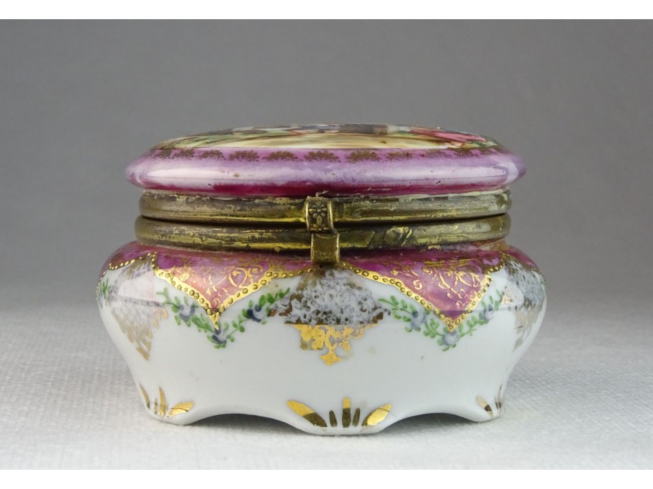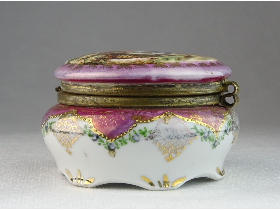Szép állapotú, nagyon régi, fedeles porcelán ékszertartó szelence. Rózsaszín díszítés mellett gazdagon aranyozott. Tetején Jancsi és Juliska mesejelenet látható.