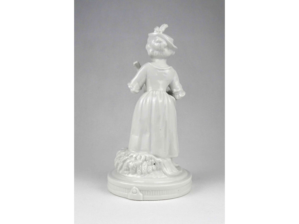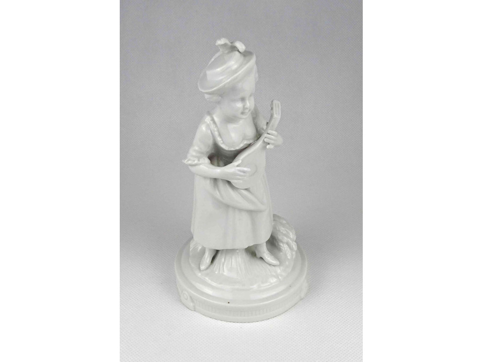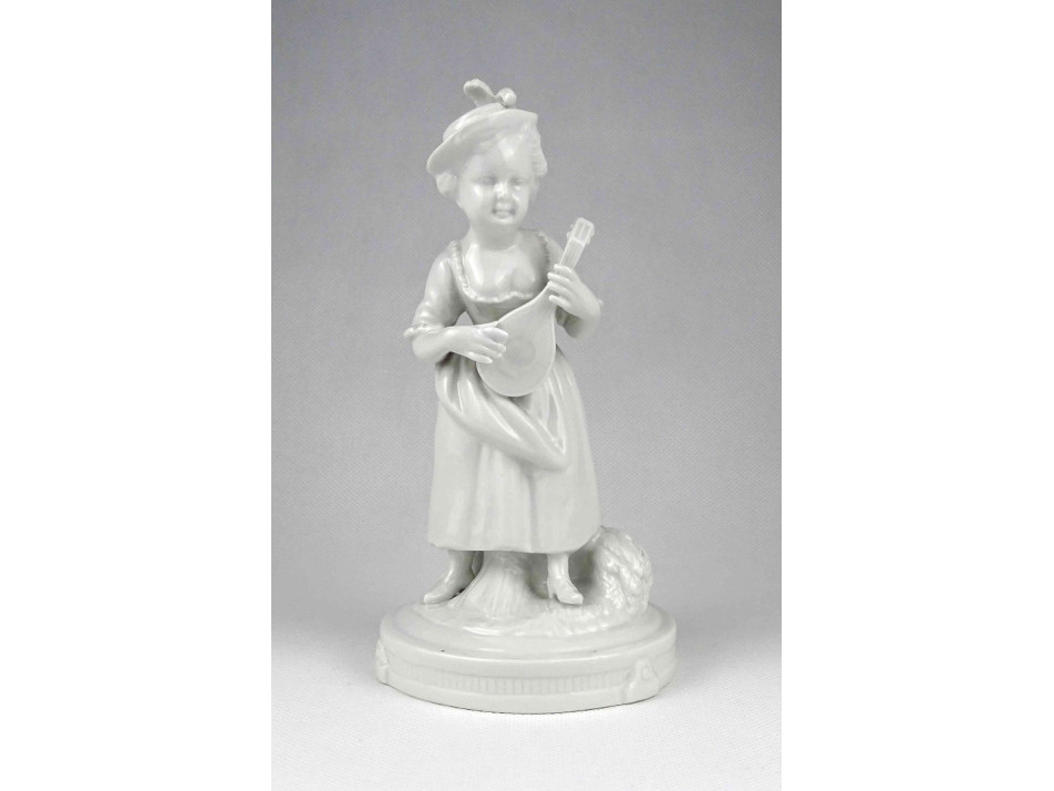 Antik, jelzetlen, német festetlen fehér porcelán figura az 1900-as évek elejéről. Kalapos kislány kezében lanttal. Jobb kezének mutatóujja restaurátor által szakszerűen javított.