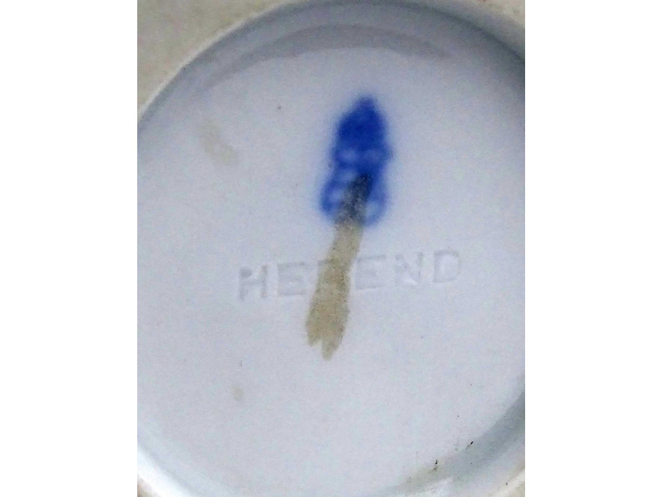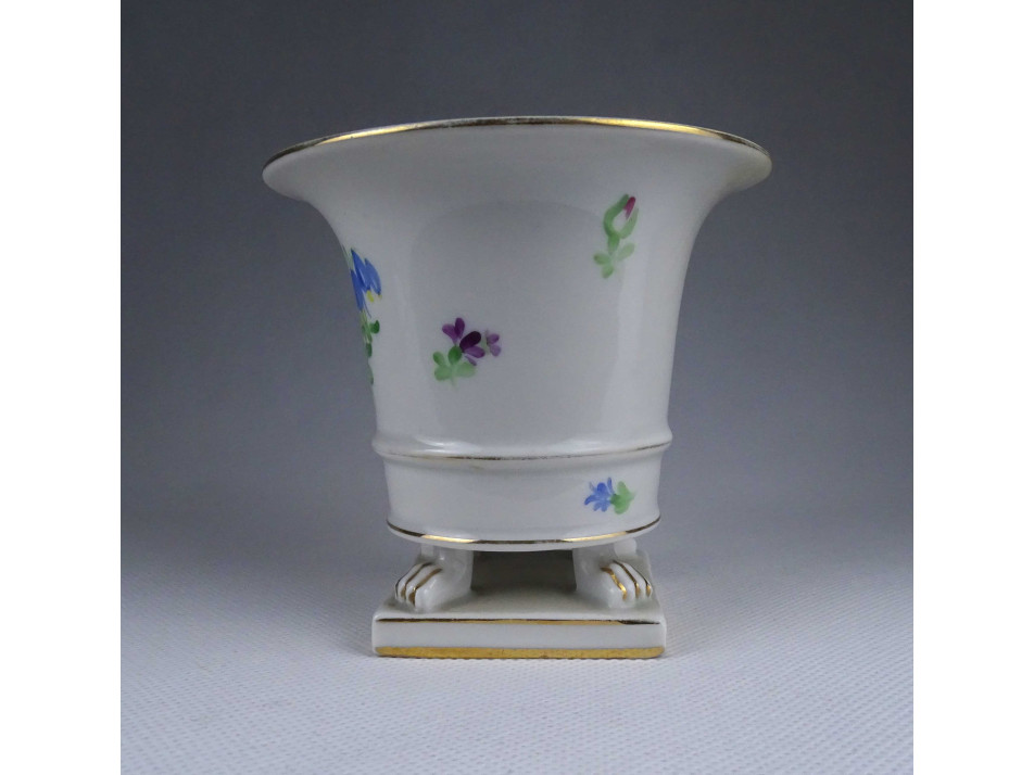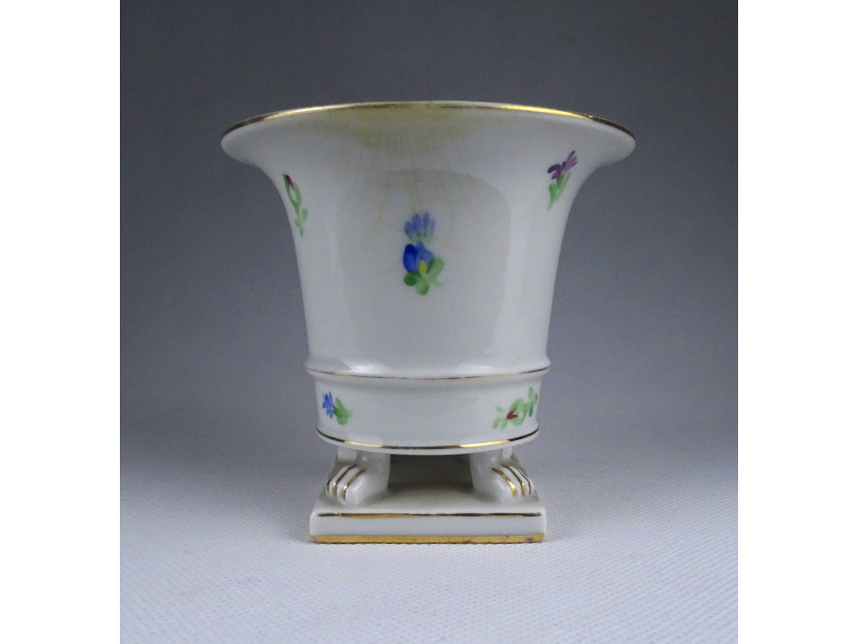 Antik, szép állapotú, kézi festésű virágmintás, a peremén aranyozott, oroszlánlábakon álló, Herendi porcelán kaspó. A peremén felül egy helyen pókhálószerűen szétfutó, elszíneződött mázrepedések láthatóak.