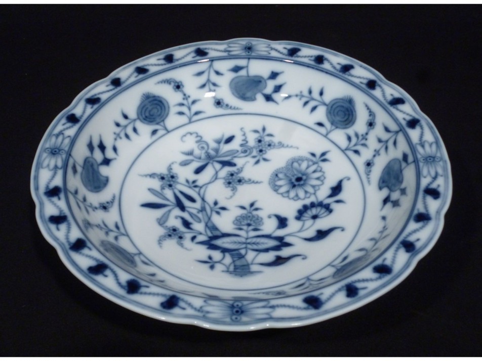 Hibátlan állapotú régi kék-fehér Meisseni mintás jelzett porcelán gyümölcskínáló tál kínálótál.