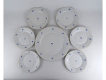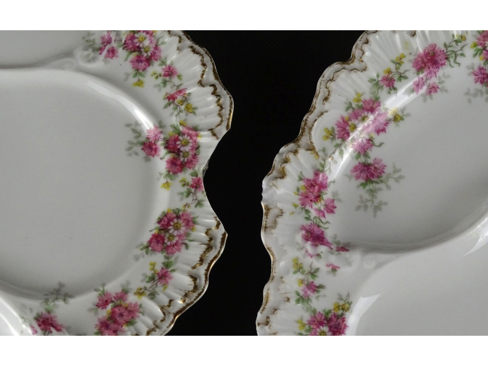 Antik, ritka francia porcelán tányér készlet. Széle aranyozott, körben kedves virágokkal díszített, háromosztatú tányérok. Nem hibátlanok, kisebb-nagyobb sérülések találhatók rajtuk.