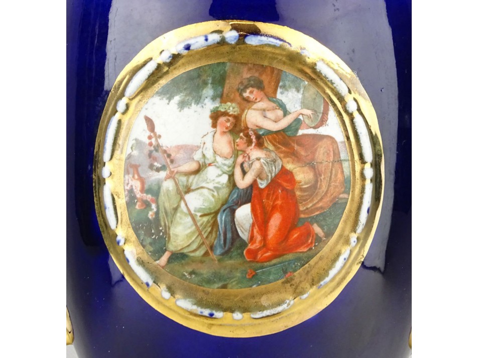 Régi, arannyal gazdagon díszített, kobaltkék színű, talapzaton álló porcelán serleg, kehely. Oldalán három alakos allegorikus jelenet. talpát profi restaurátor javította.