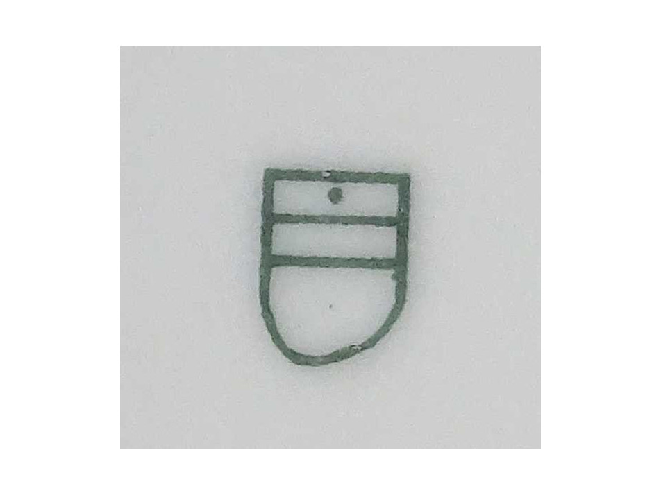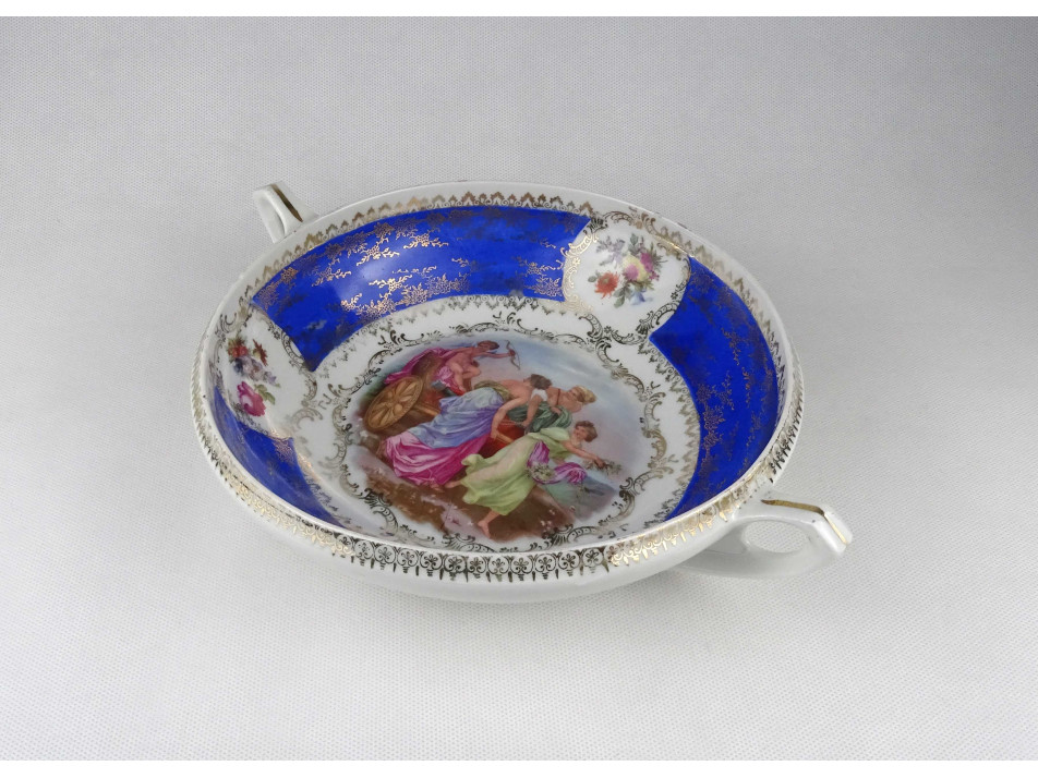 Régi, szép állapotú, kobaltkék, gazdagon aranyozott Altwien porcelán asztalközép kínáló tál. Közepén allegorikus jelenet látható. A tál felső peremén néhány apró lepattanás van.