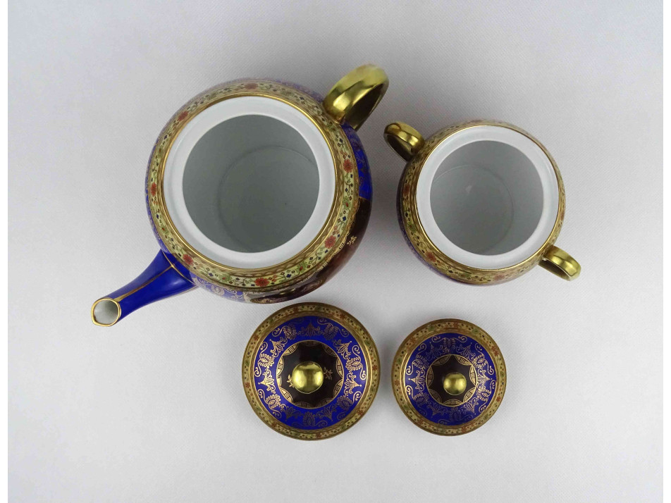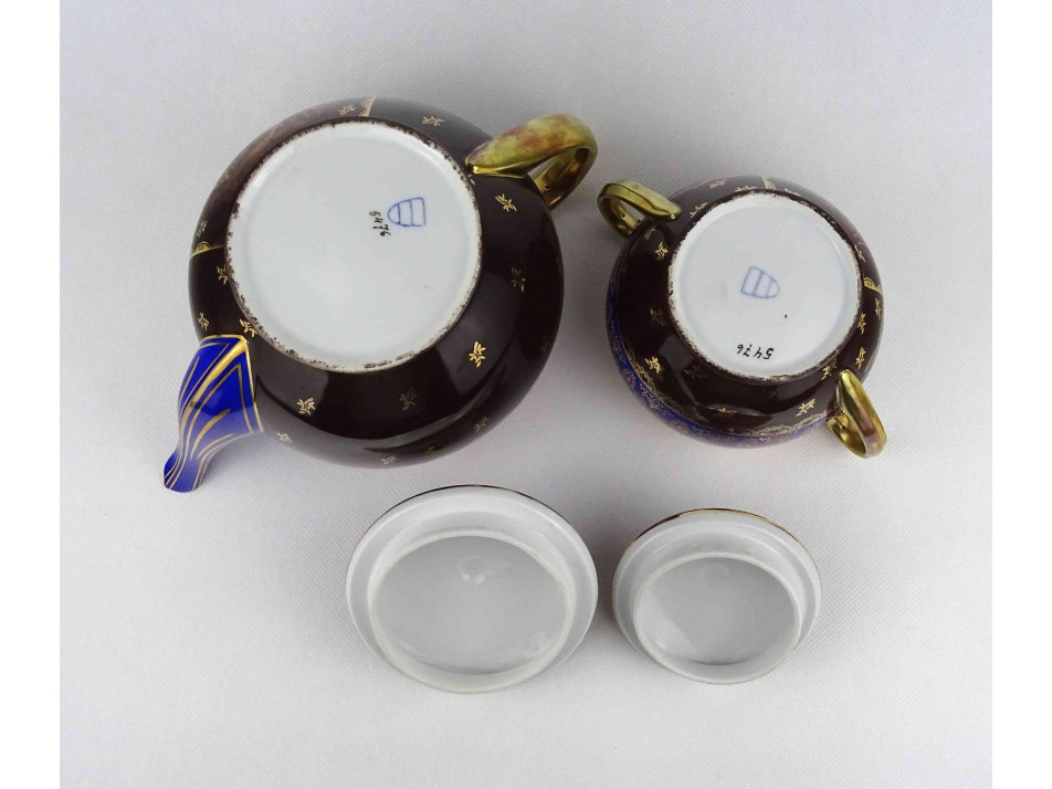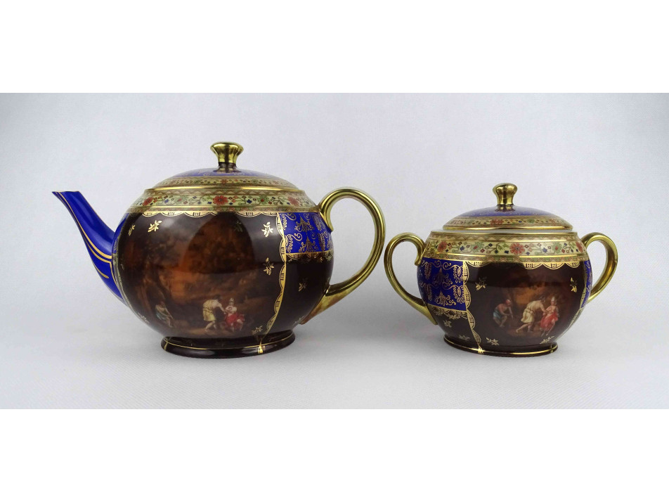 Antik kék - arany színű jelenetes Altwien porcelán teáskanna és bonbonier