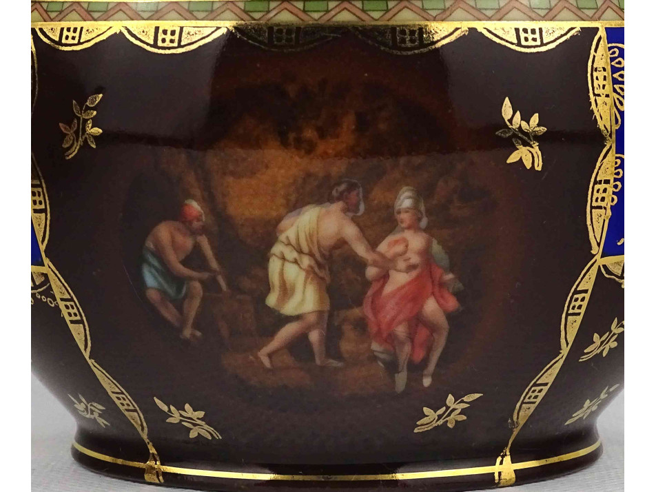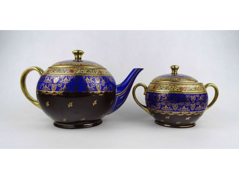Antik, hibátlan állapotú, jelzett, vastagon aranyozott, kobaltkék színű, antik jelenettel díszített Altwien porcelán teáskanna a hozzá tartozó bonbonierrel.