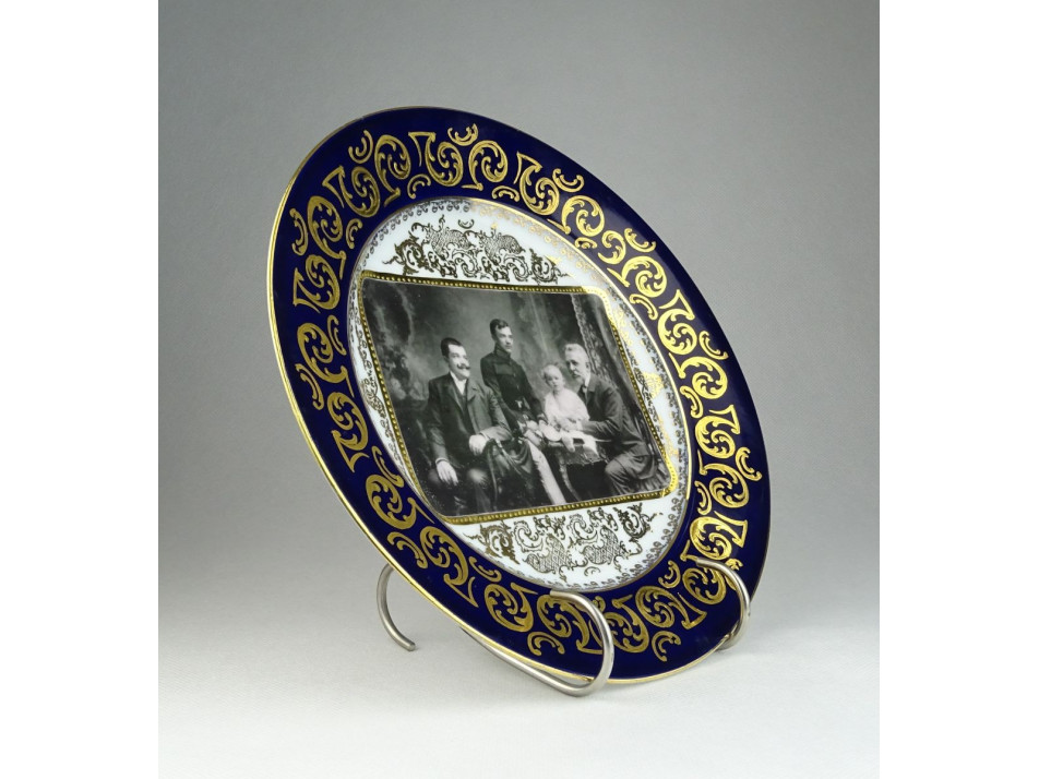 Hibátlan állapotú, jelzett Altwien családi porcelán, porcelán tányér. Rajta négy alakos családi fotográfia. Pereme kobaltkék színű, arannyal gazdagon díszített.