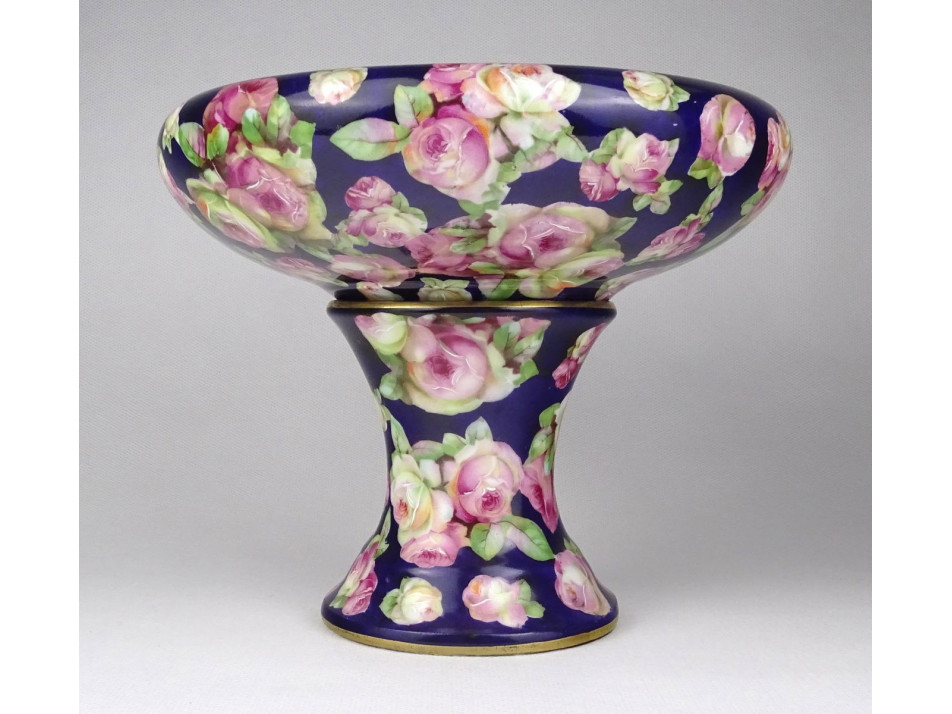 Régi, hibátlan állapotú lila színű, rózsákkal díszített porcelán asztalközép kínáló tál. Két darabból áll, külön, láb nélkül is használható a tál.