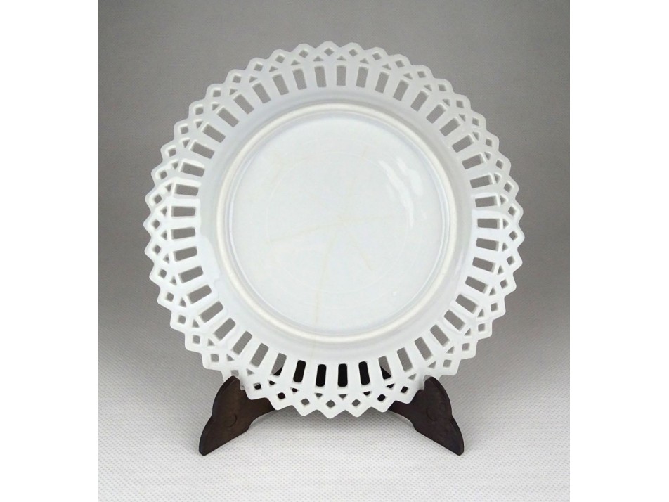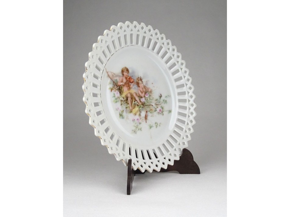 Antik, szép állapotú, áttört szélű, porcelán dísztányér. A tányért két puttó, angyal díszíti. A mázon a tányér alján hajszálrepedés található, lásd fotó. A tányér nem repedt!