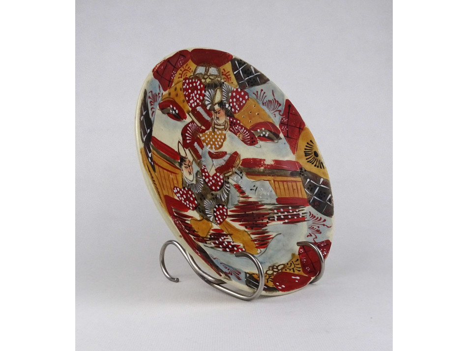 Antik, hibátlan állapotú, gazdagon díszített, kézzel festett, japán szamuráj alakos fajansz dísz tál, falitál. Falraakasztási lehetőséggel.