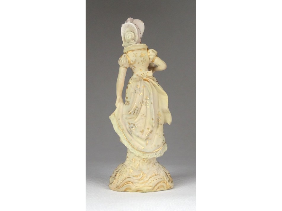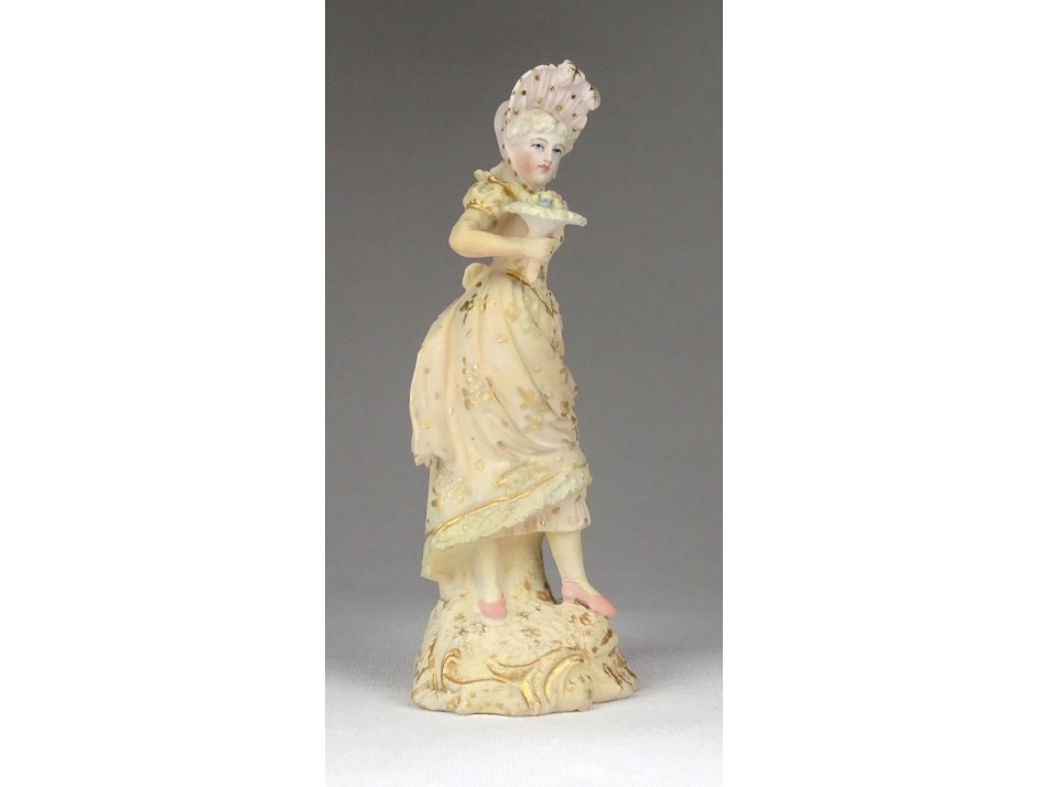 Antik szép állapotú barokk porcelán figura talapzaton. Felülete máz nélküli biszkvit, kézi festéssel és aranyozással díszített. Kalapos barokk porcelán hölgy, kezében virágcsokor. A darabot profi restaurátor javította.