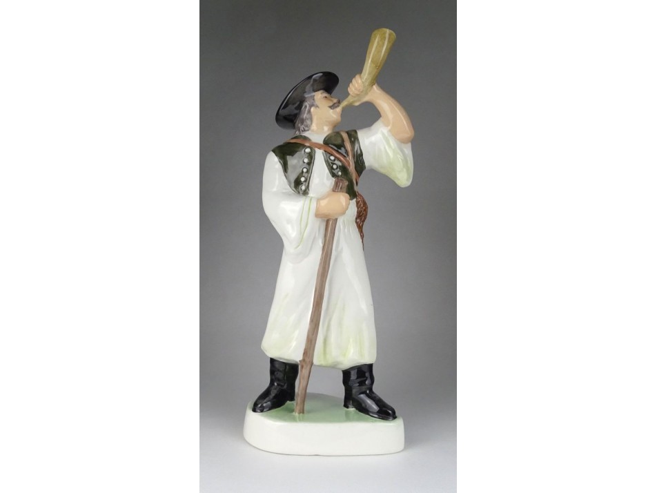 Régi szép állapotú nagy méretű porcelán csikóslegény kézi festéssel díszítve. Kezében szarukürt, fején kalap, hátán kulacs. A darabon kisebb mázhibák találhatók, lásd fotó.