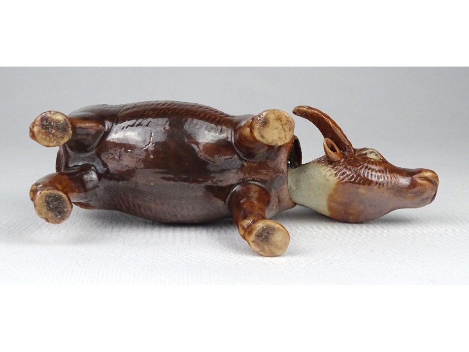 Régi, hibátlan állapotú barna mázas keleti porcelán bivaly figura. Feje egy dróton billeg, bólogat.