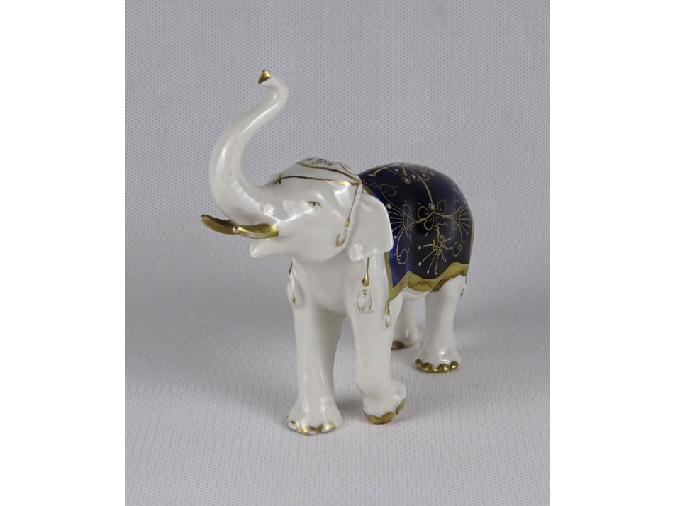 Hibátlan állapotú, szerencsehozó, felfelé álló ormányú porcelán elefánt. Rajta kobaltkék és aranyozott díszítés.