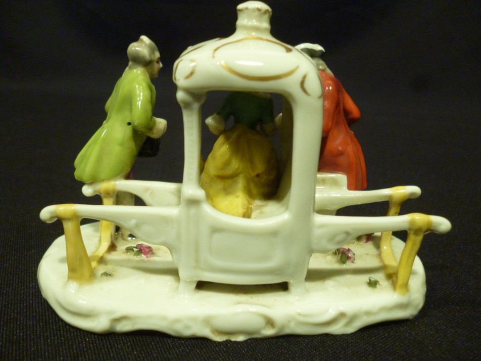 Szép állapotú miniatűr, gazdagon aranyozott, kézi festéssel díszített nagyon régi Meisseni jellegű 3 alakos főúri jelenet talapzaton.