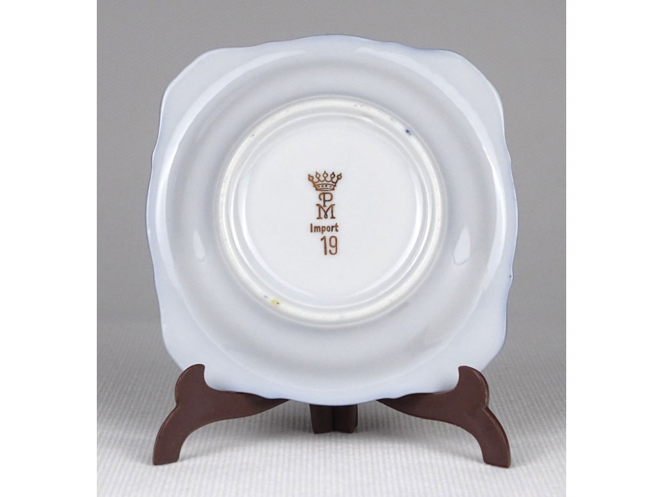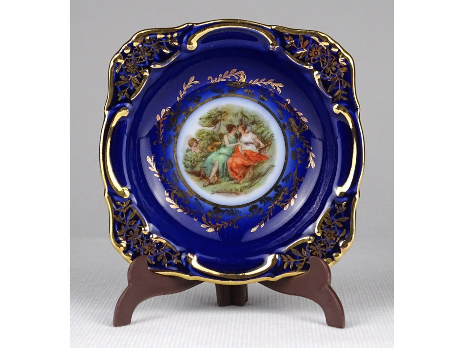 Hibátlan állapotú, kobaltkékkel, arannyal és közepén háromalakos allegorikus jelenettel díszített porcelán gyűrűtartó tálka. A jelenet két hölgyet és Kupidót ábrázolja.
