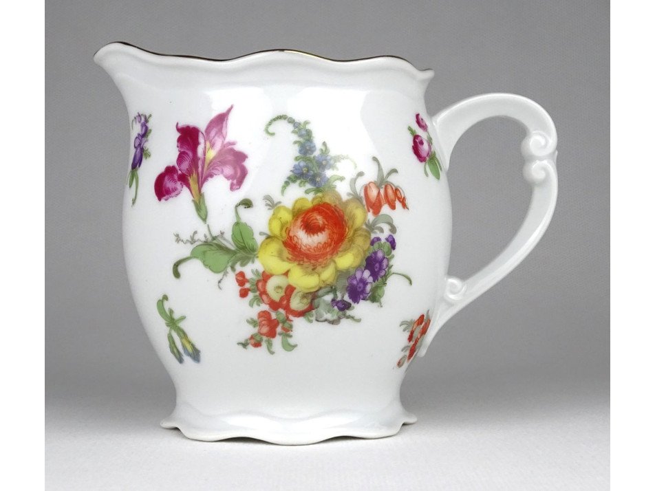 Régi szép állapotú jelzett virágdíszes, porcelán kiöntő aranyozott széllel. Alján a jelzésnél vékony hajszálrepedés található.