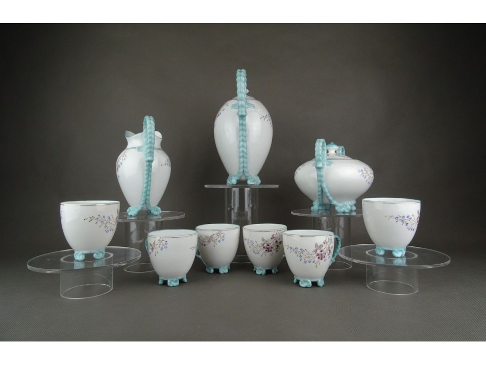 Antik, hibátlan állapotú, kézi festéssel díszített, virágdíszes, fonott füles, lábon álló teáskészlet kávéskészlet aranyozott peremmel.