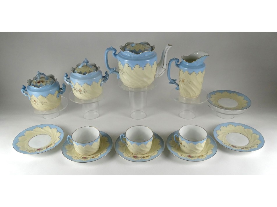 Gyönyörű antik halványkék és vajszínű porcelán teáskészlet kézi festéssel díszítve.