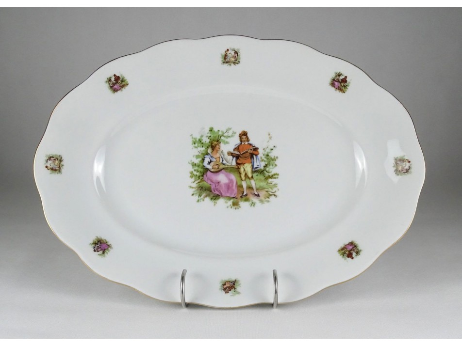 Régi, szép állapotú porcelán tányérkészlet, étkészlet. Rajtuk kétalakos szerelmes, allegorikus jelenet látható, lásd fotó.