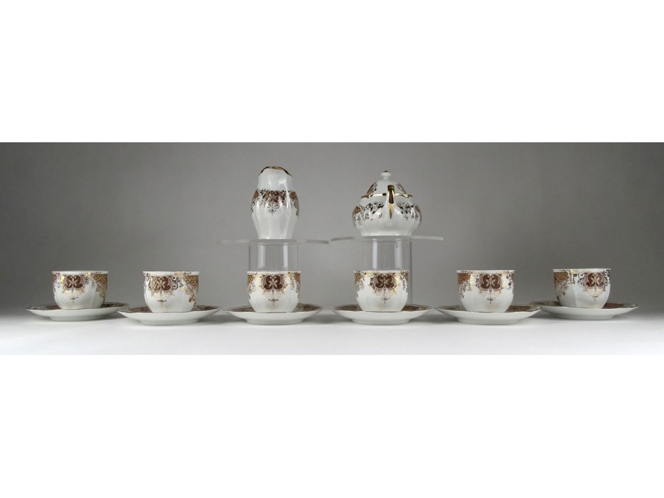Hibátlan állapotú, porcelán kávéskészlet, gazdagon aranyozva, barna-arany mintákkal díszítve.