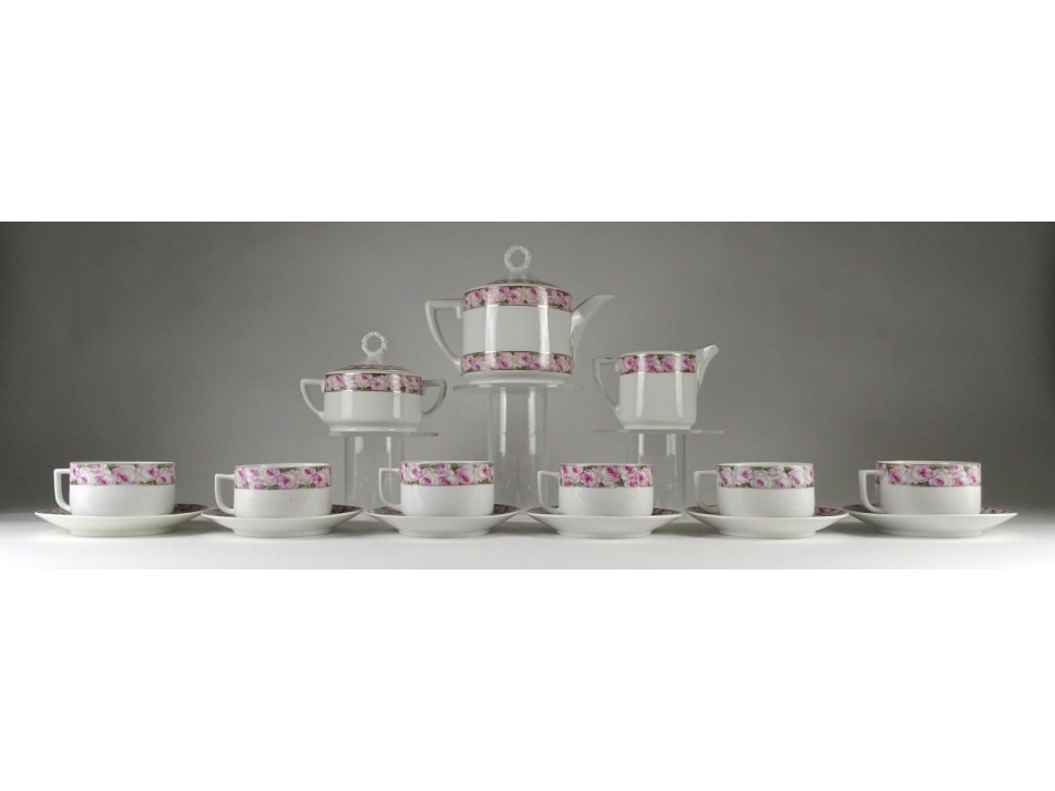 Régi szép állapotú, rózsaszín virág mintás, rózsadíszes porcelán teáskészlet aranyozott szegéllyel.