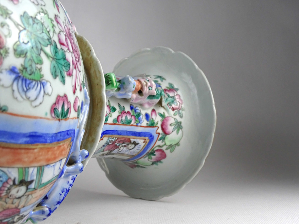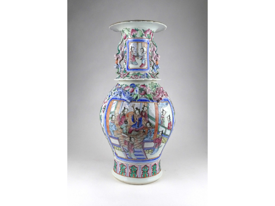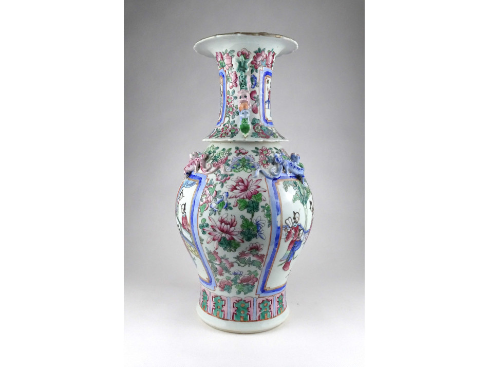 Antik, nagyméretű, plasztikus állatfigurákkal és kézi festéssel díszített, kínai porcelán díszváza, padló váza, oldalán sokalakos jelenetekkel és aprólékos virágmintákkal. Vastag porcelán, fajansz tárgy. A felső pereme szakszerűen javított, restaurált.