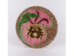 A tál közepén domináns bordó felületen finoman cizellált arany rózsa díszítés látható.