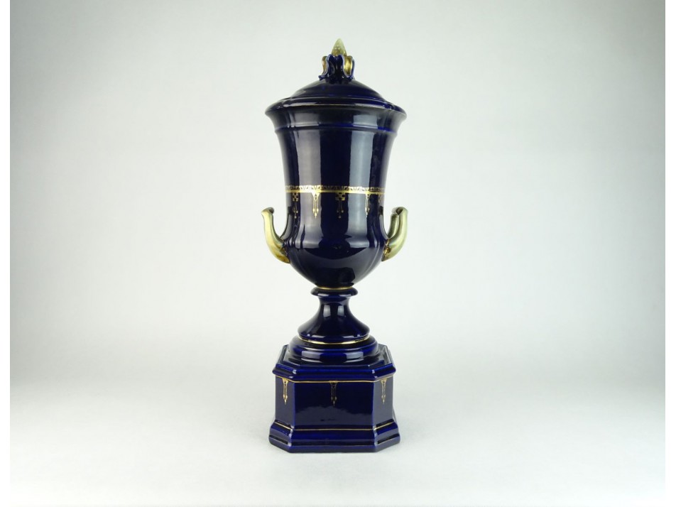 Szép állapotú, antik, jelzett kobaltkék porcelán arannyal dúsan, gazdagon díszített jelenetes nagy méretű dísztárgy, füles urnaváza.