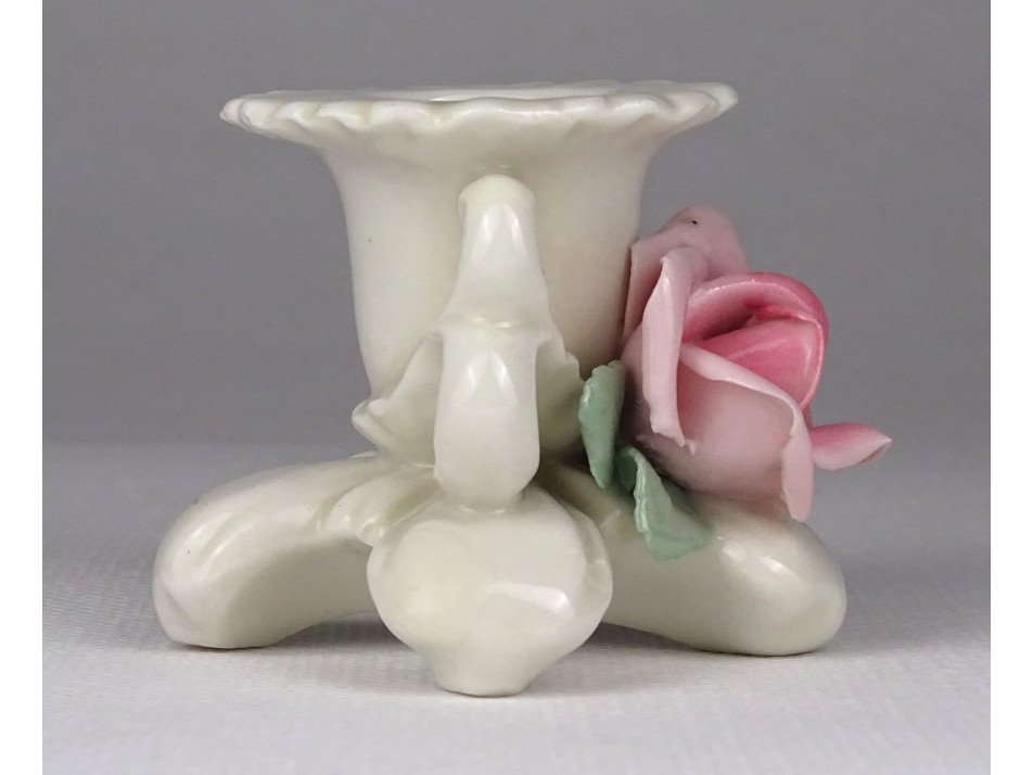 Régi hibátlan állapotú kis méretű német porcelán gyertya tartó, rajta középen plasztikus rózsa díszítéssel.