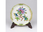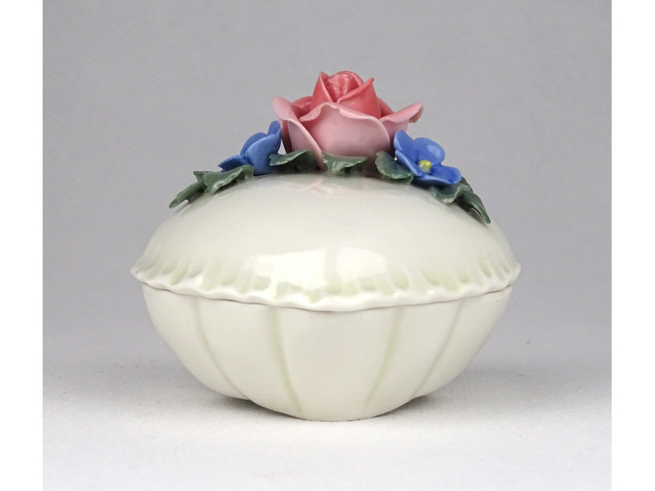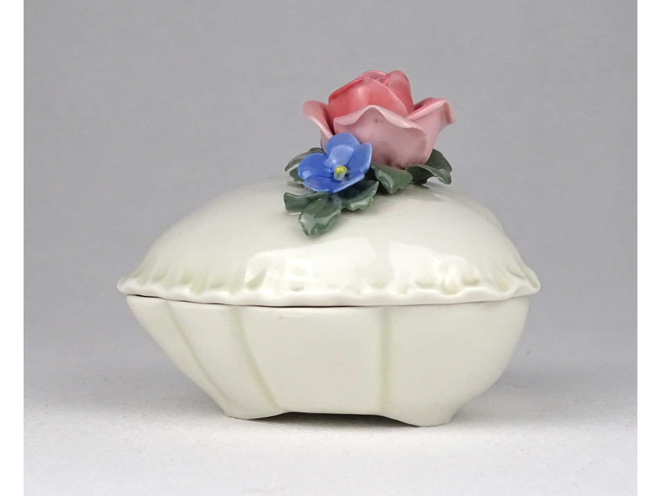 Hibátlan állapotú, barokkos formájú szív alakú, tetején rózsa fogantyús ENS porcelán bonbonier, ékszertartó. A rózsaszirmokon egy-két apró lepattanás található, alig észrevehető.