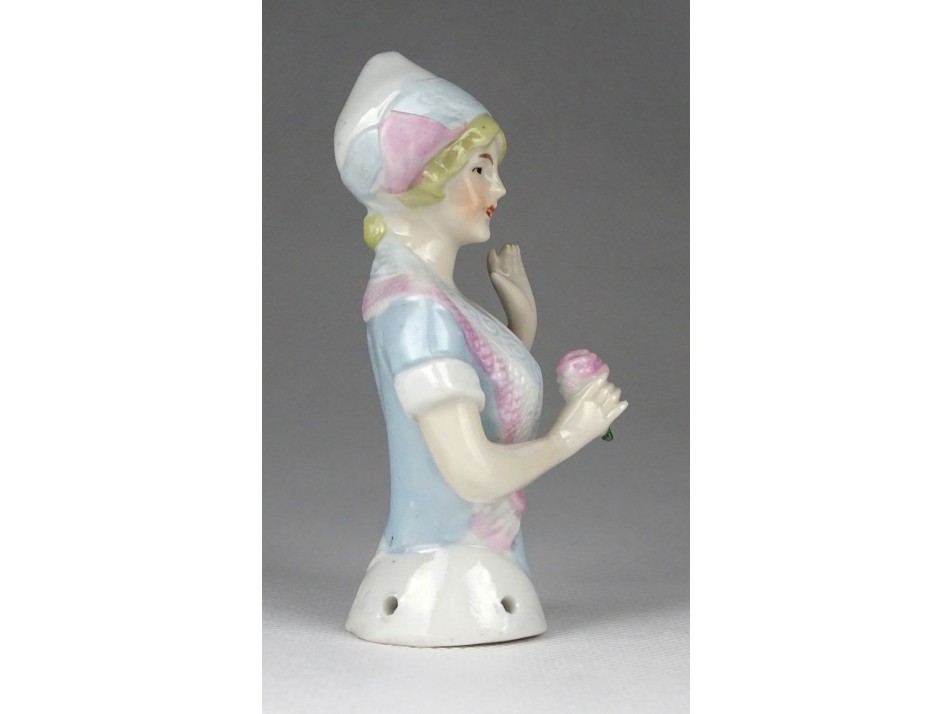 Antik kézzel festett porcelán teababa test az 1800-as évek végéről. Baba felső test, kezében virág. A kalap peremén apró lepattanás található, lásd fotó.