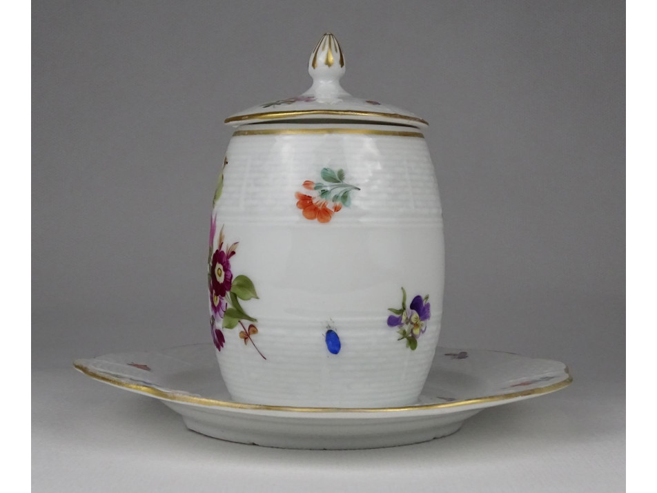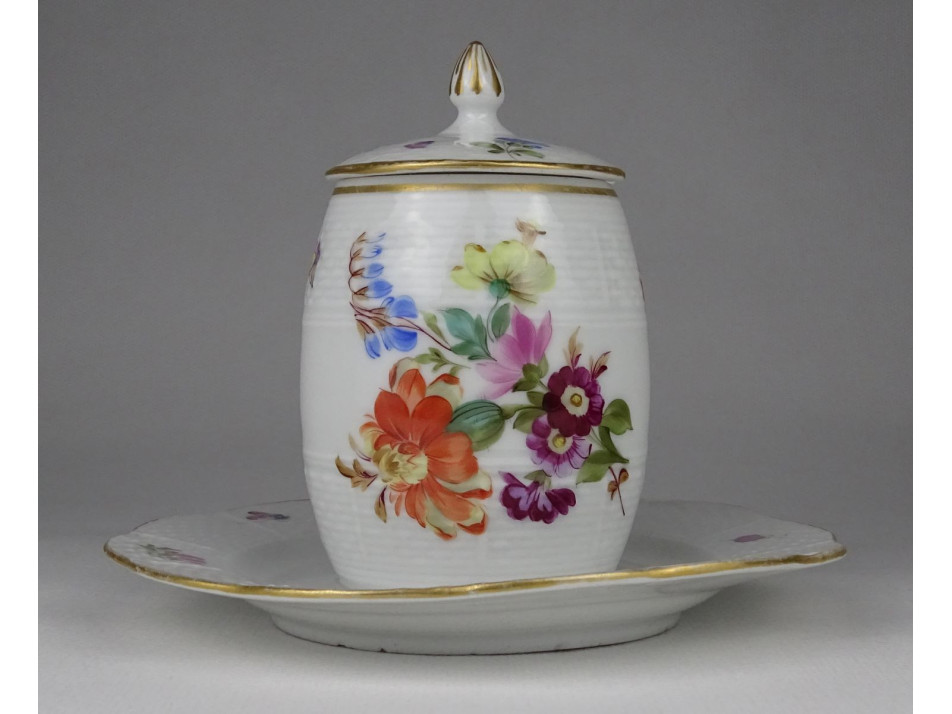 Antik, hibátlan állapotú kézi festésű virág és bogár, rovar mintás fedeles Herendi porcelán desszert, lekvár kínáló.