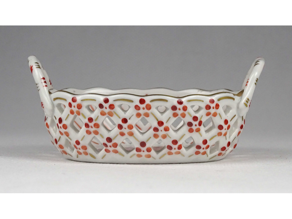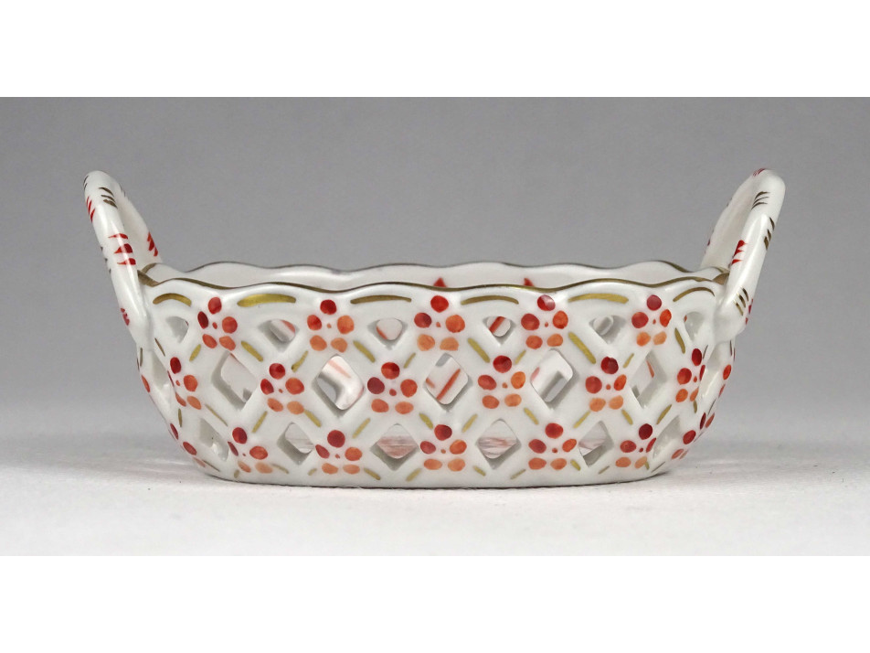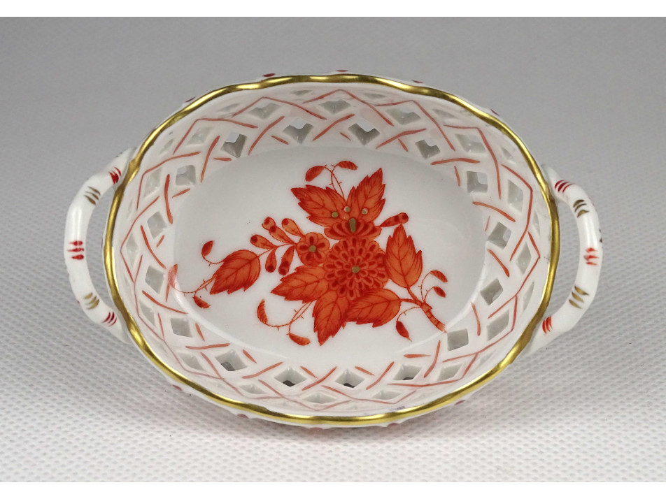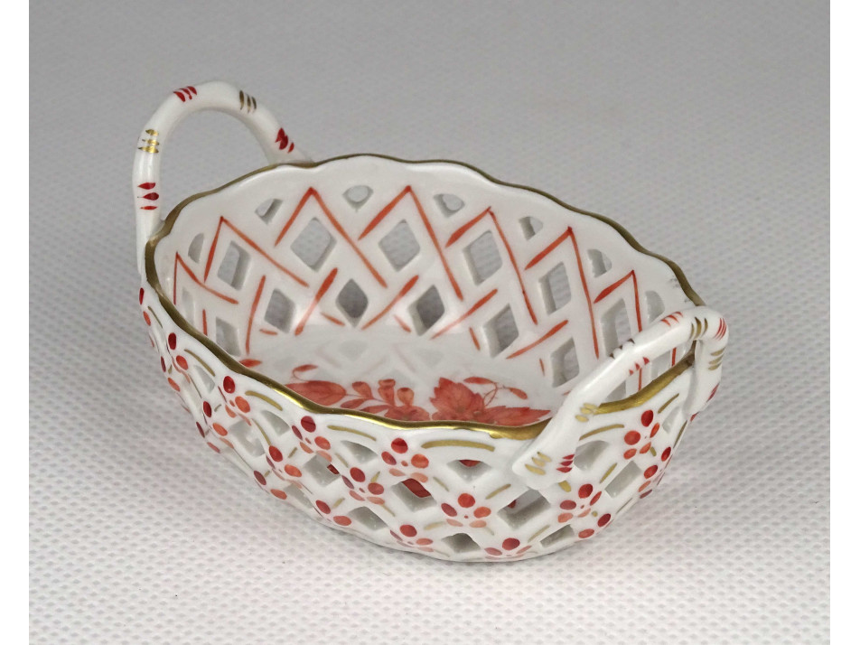 Régi, ovális alakú, kisméretű Herendi porcelán áttört gyűrűtartó kosárka. Rajta kézzel festett Apponyi mintás díszítés.