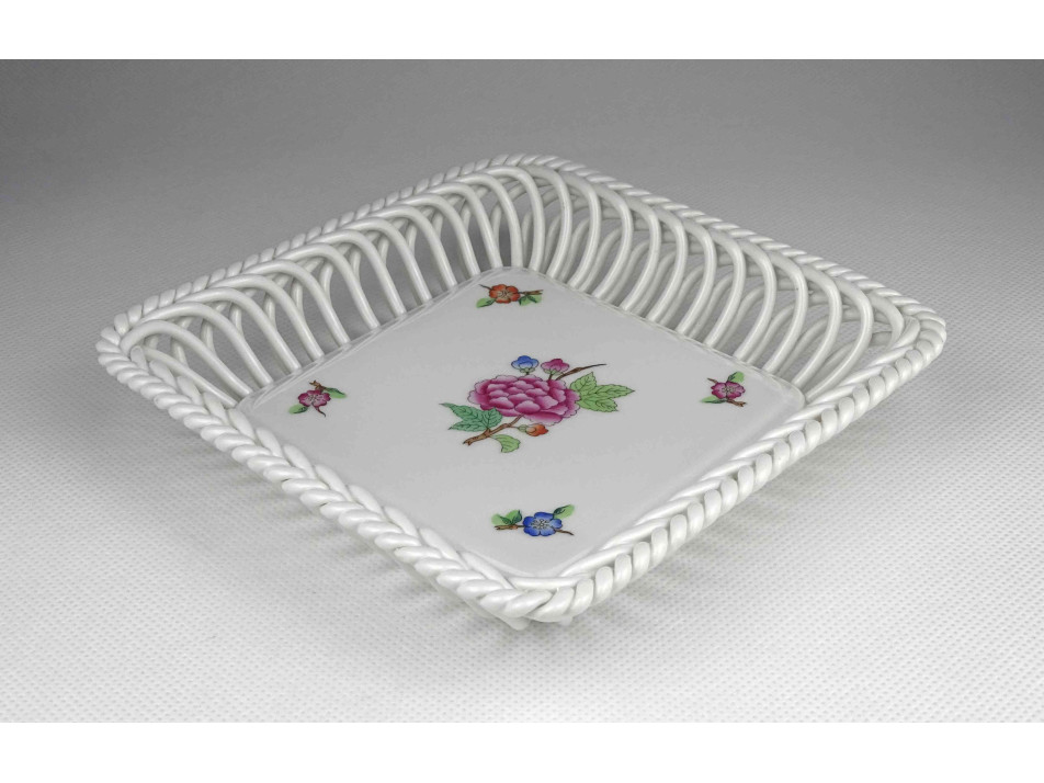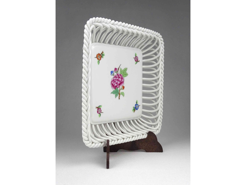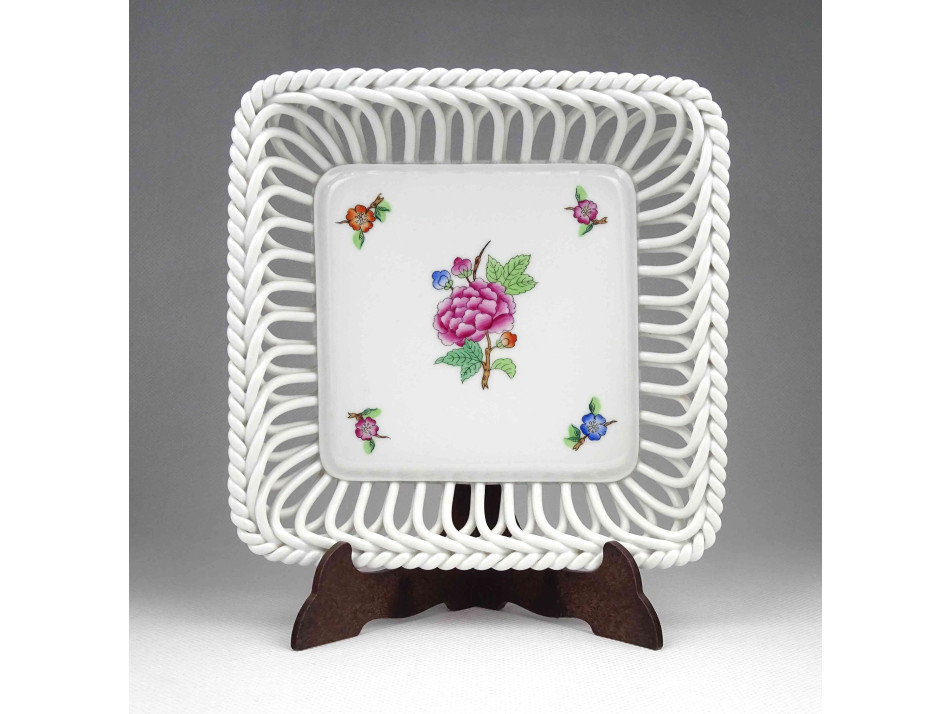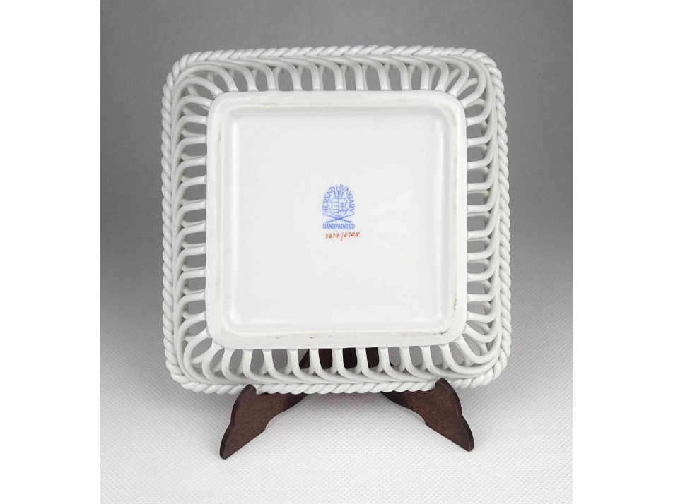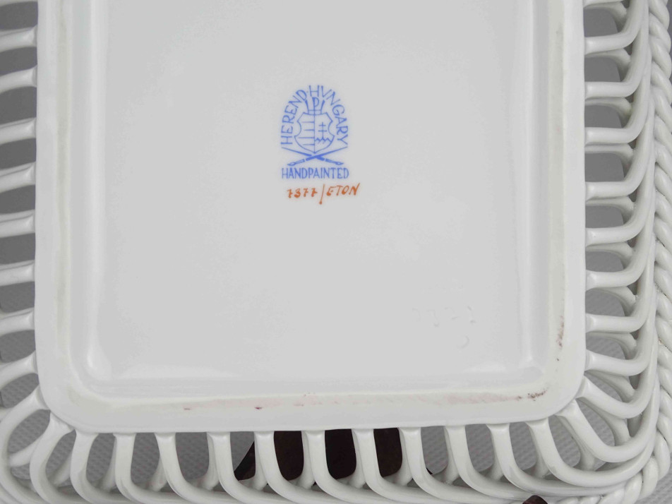 Régi, hibátlan állapotú, jelzett, szélén áttört, fonott, szögletes alakú, kézzel festett, Eton mintás Herendi porcelán kínáló tál.