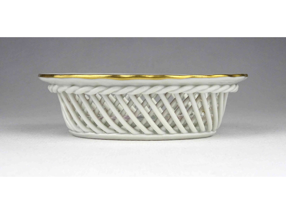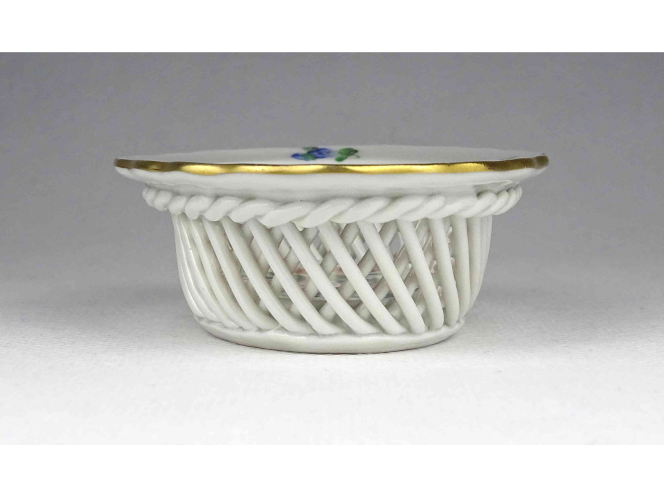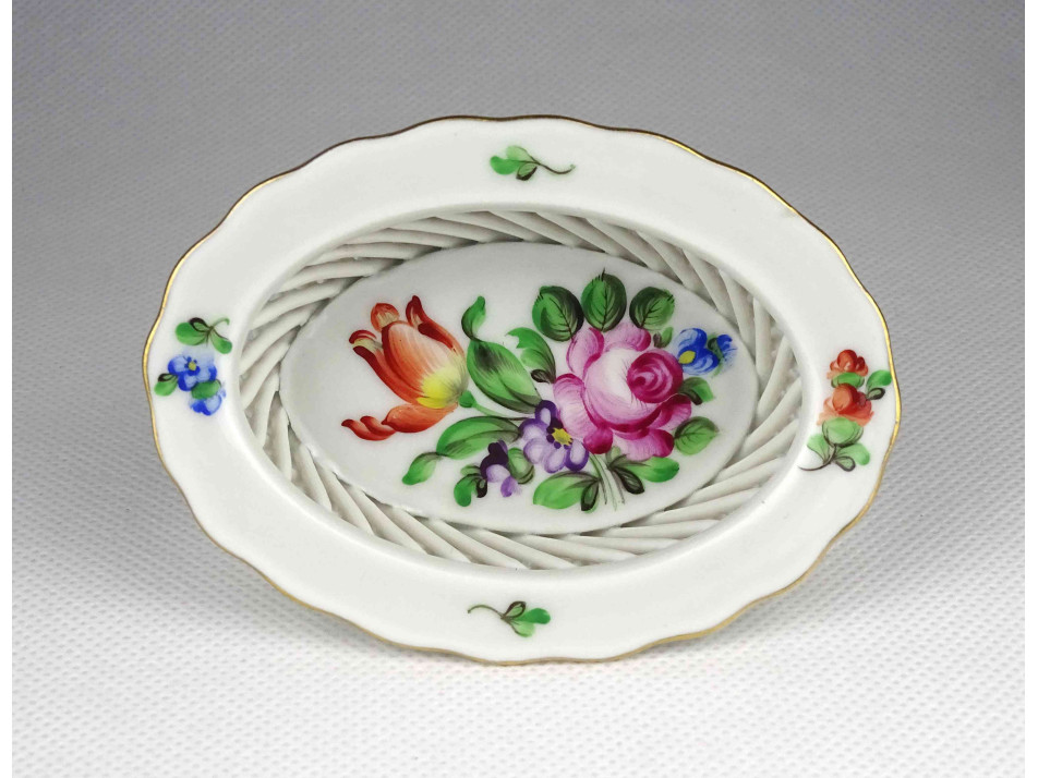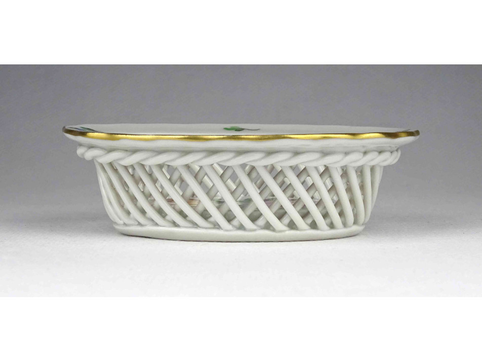 Régi, kisméretű, ovális alakú, virág mintás Herendi porcelán fonott kosárka.
