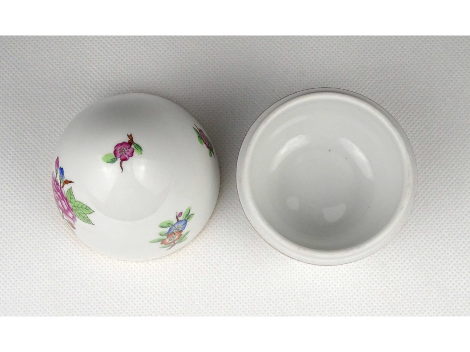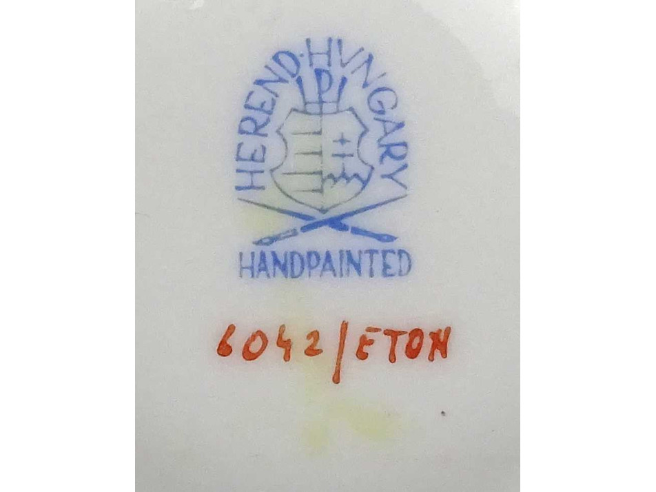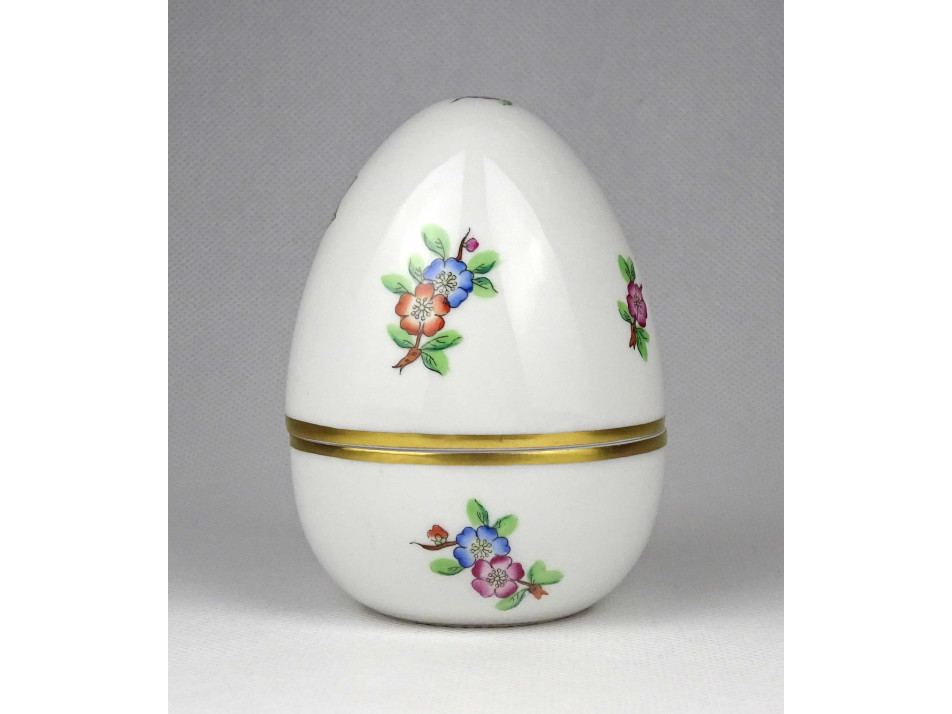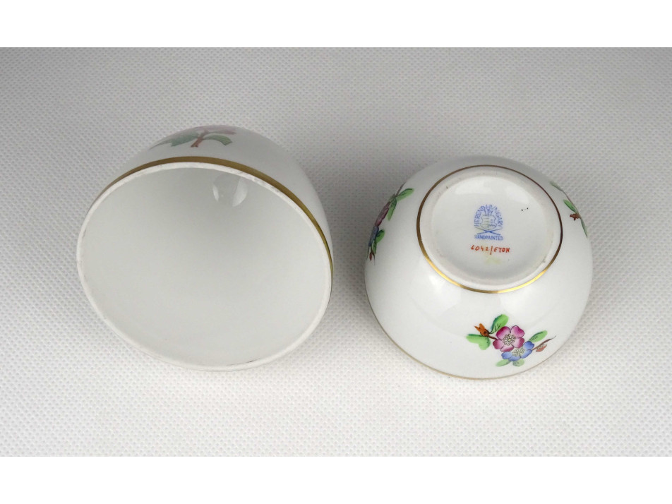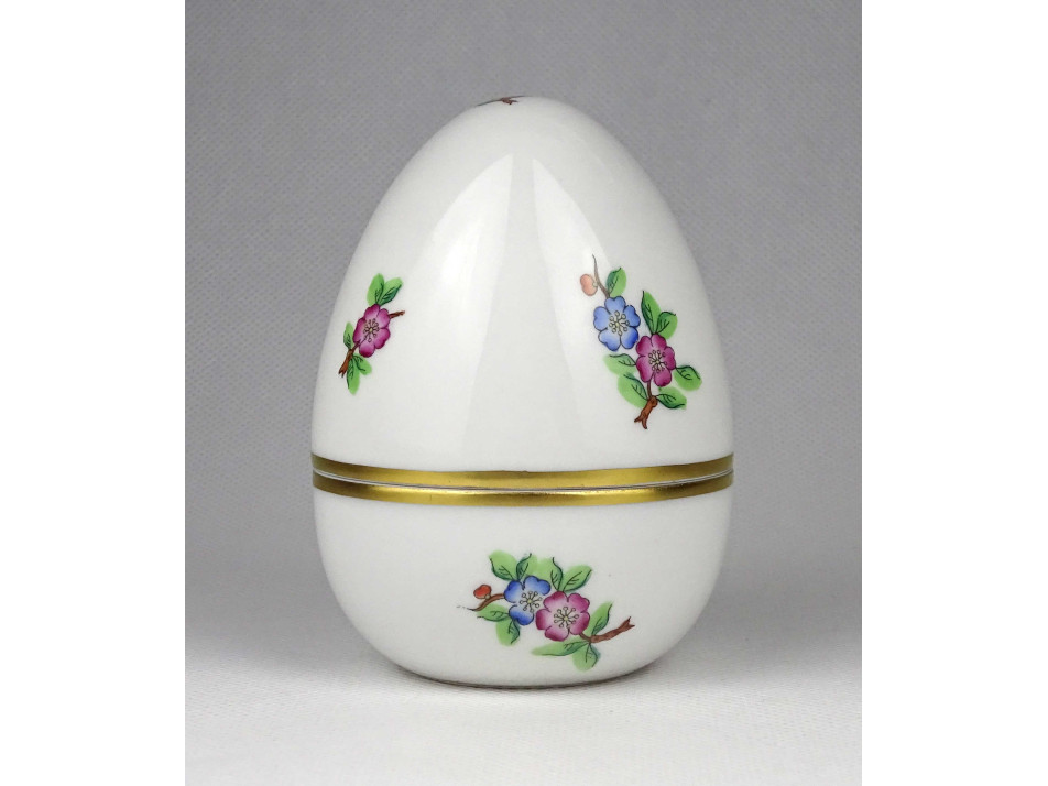 Hibátlan állapotú, Eton mintás, álló formátumú, tojás alakú porcelán gyűrűtartó, ékszertartó, bonbonier. Aranyozása is kopásmentes, ajándékozható állapotban van.