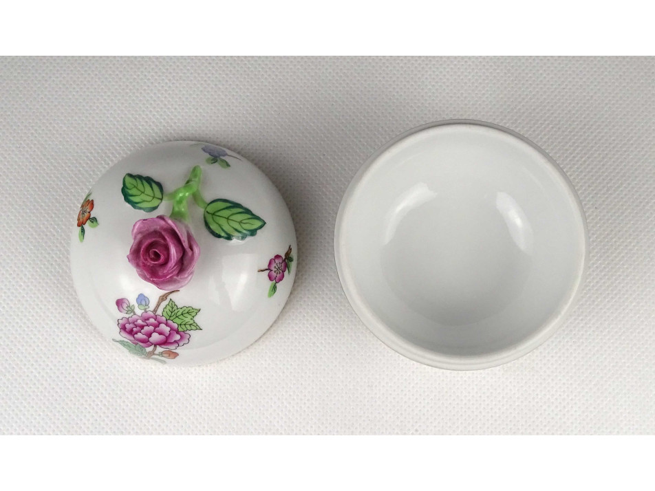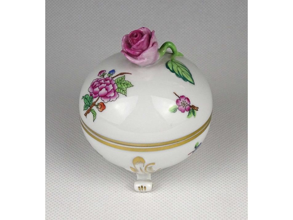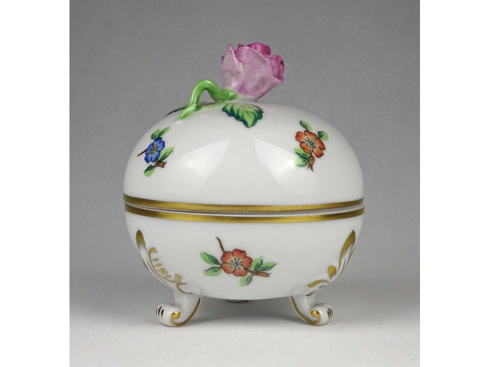 Hibátlan állapotú, három lábon álló, rózsa fogantyús, eton mintás Herendi porcelán bonbonier.