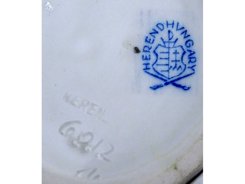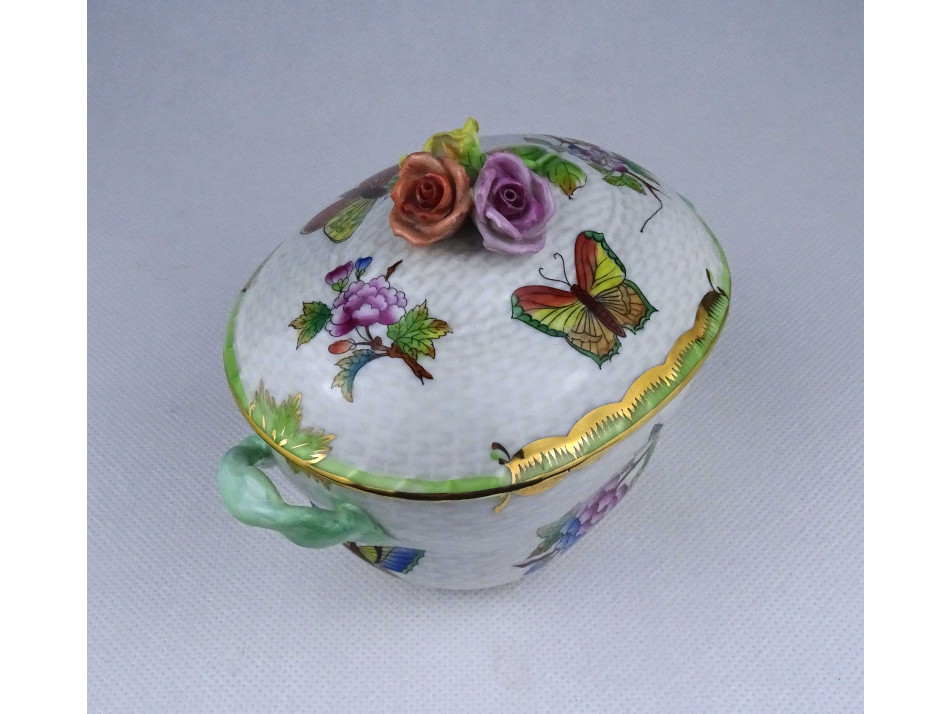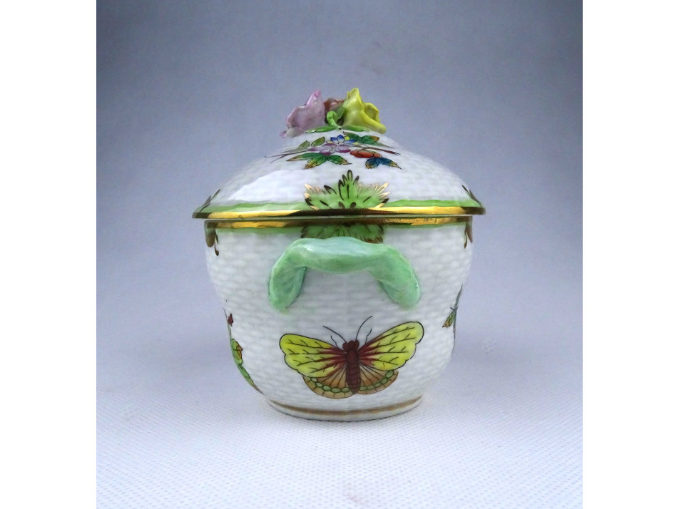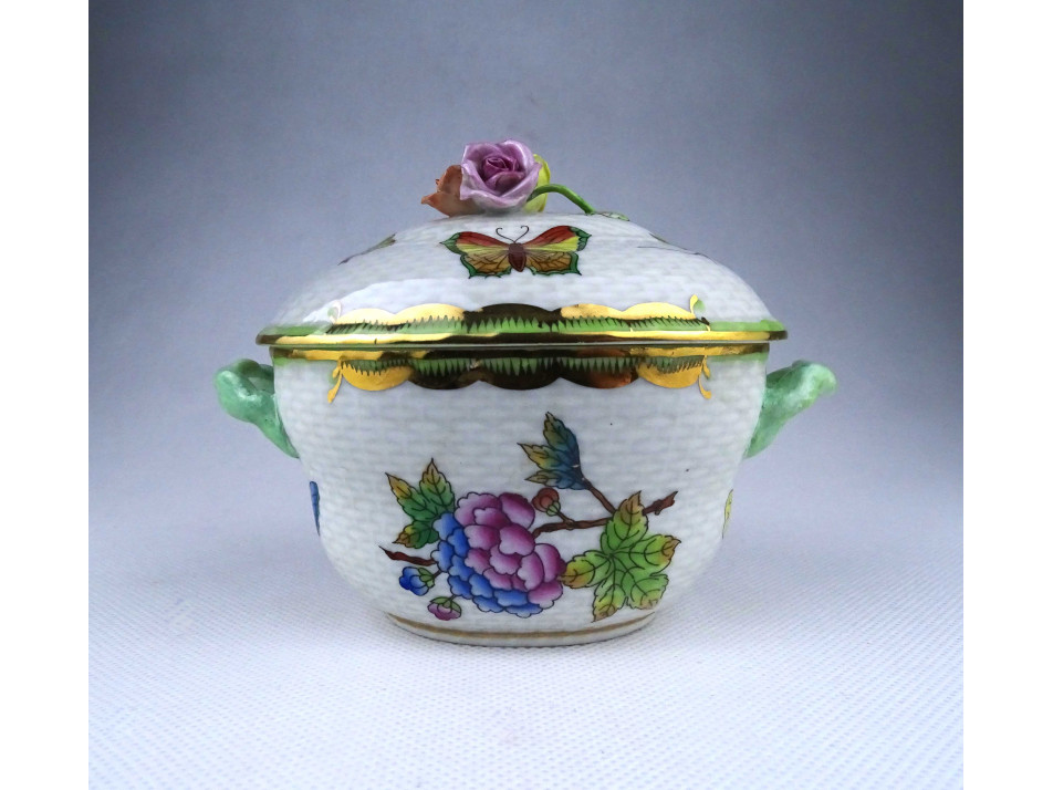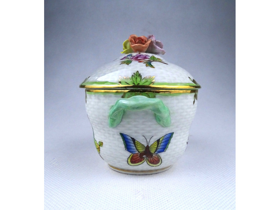 Régi, szép állapotú, Viktória mintás Herendi porcelán bonbonier, tetején hármas rózsa díszítéssel. Fülei restaurátor által szakszerűen javítottak.