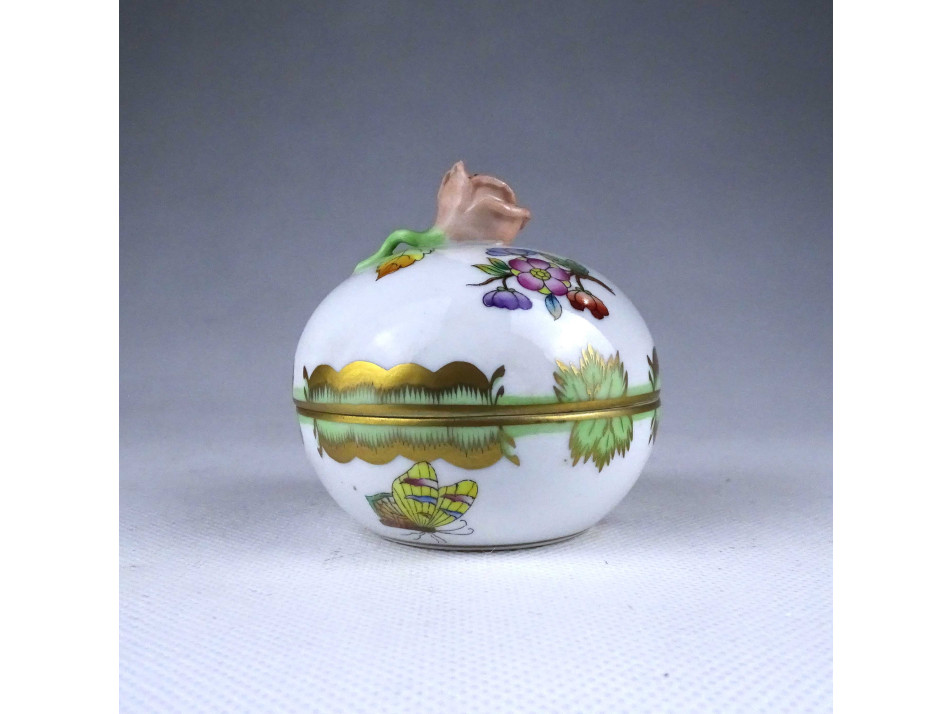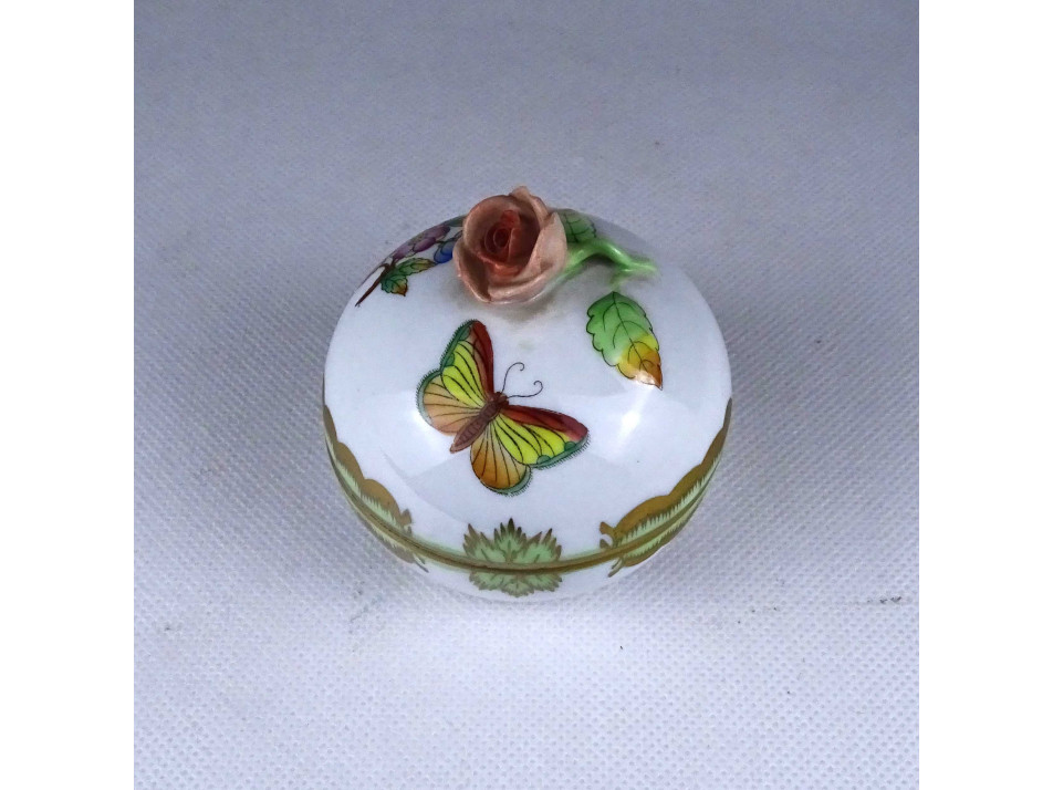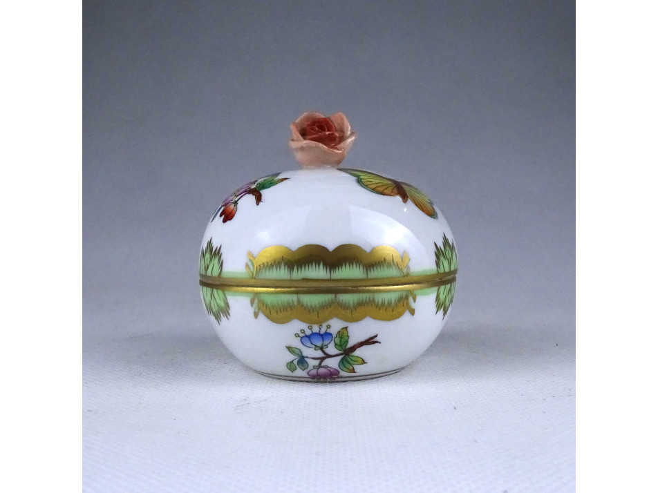Régi, hibátlan állapotú, Viktória mintás Herendi porcelán ékszertartó bonbonier, fedelén plasztikus rózsa fogantyúval.