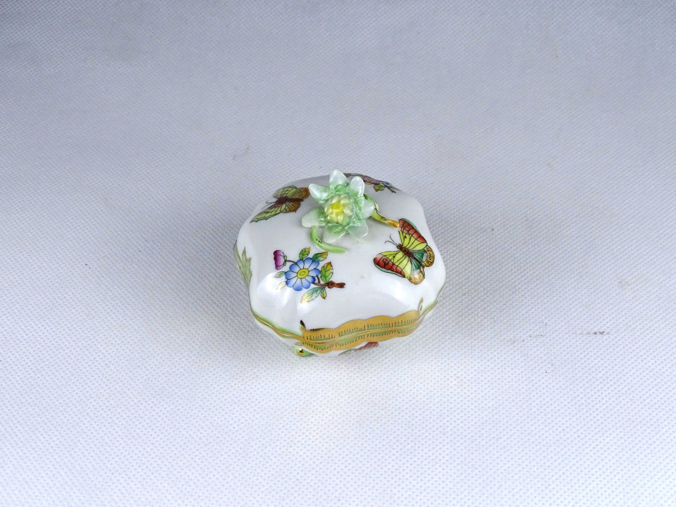 Hibátlan állapotú, nyolcszög alakú, négy kis lábon álló, viktória mintás Herendi porcelán bonbonier, tetején plasztikus virág díszítéssel. A virág szirmai közűl három restaurátor által szakszerűen javított.