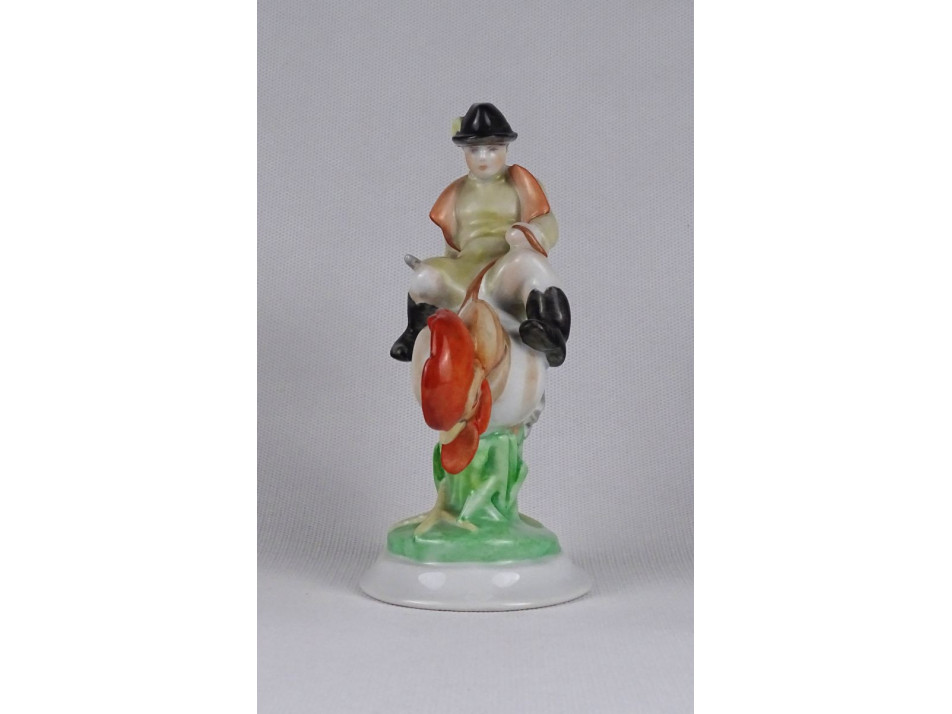 Hibátlan állapotú, régi, kézi festéssel díszített Kakas Marci porcelán figura.