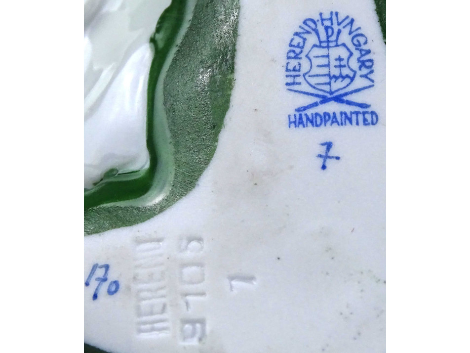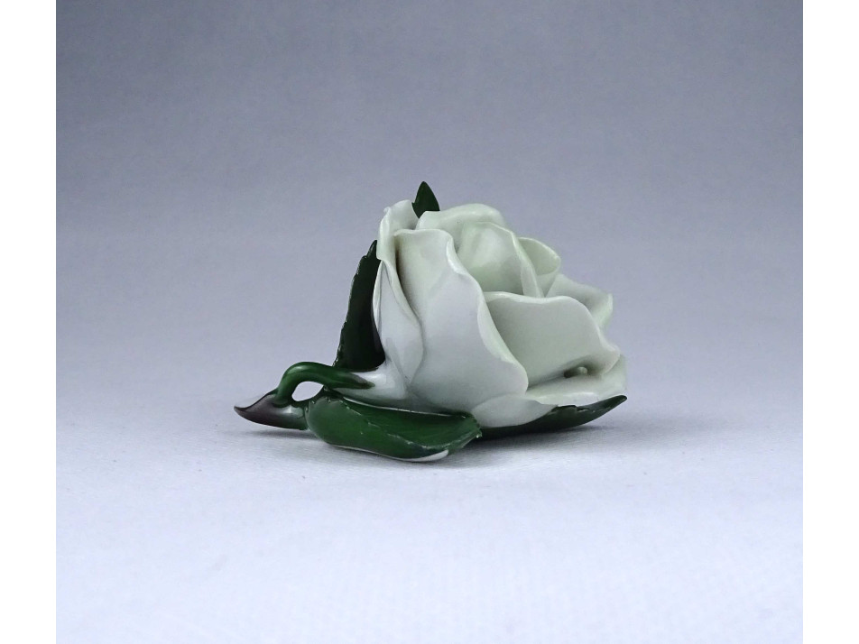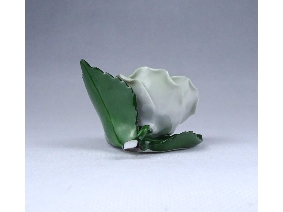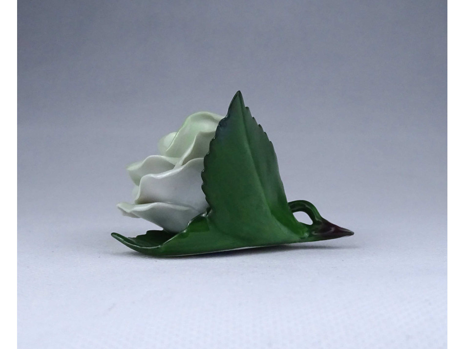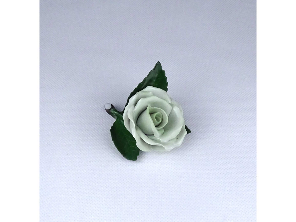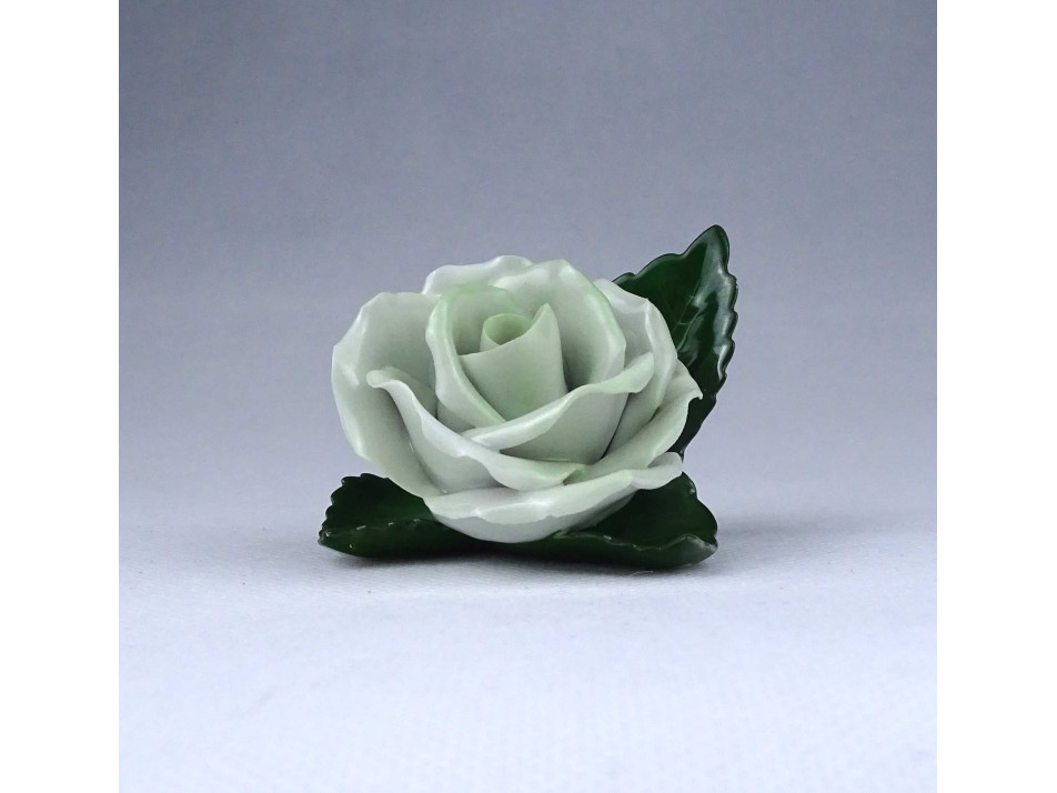 Régi, hibátlan állapotú, halványzöld Herendi porcelán rózsa. Az egyik levél széle restaurátor által szakszerűen javított.