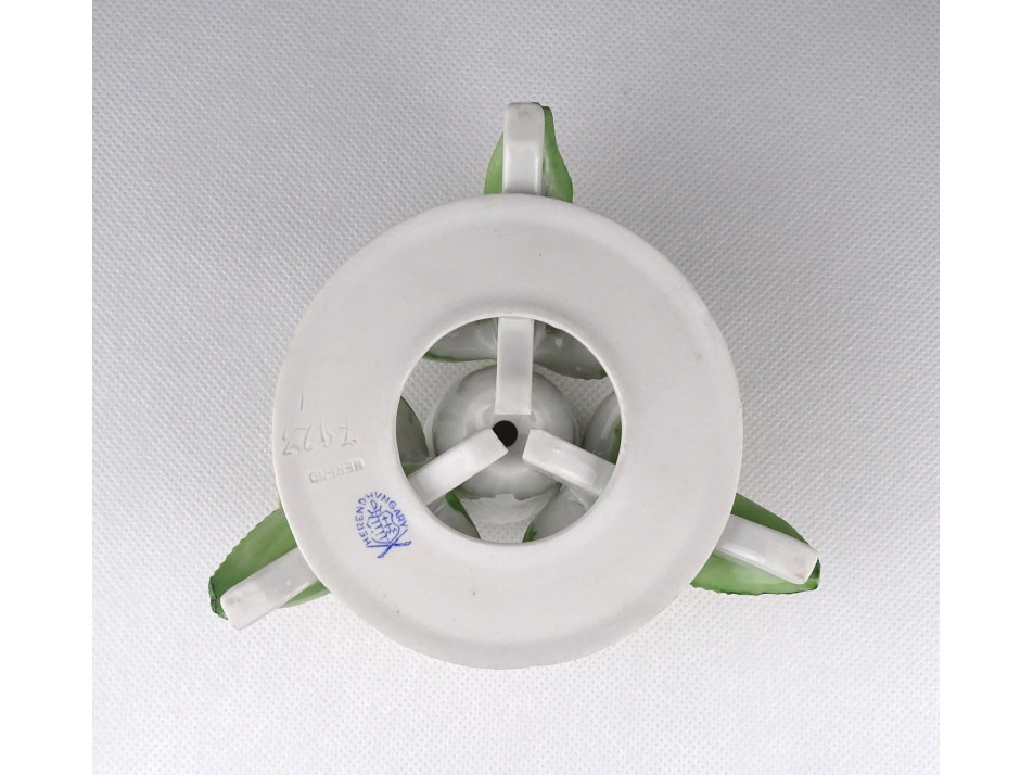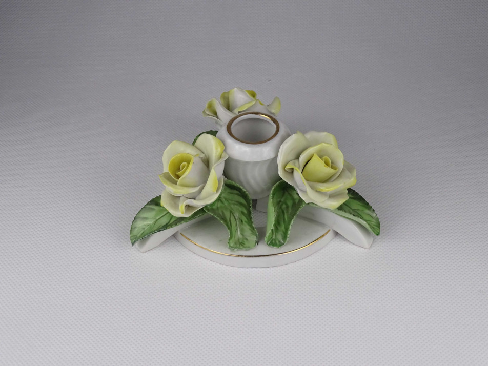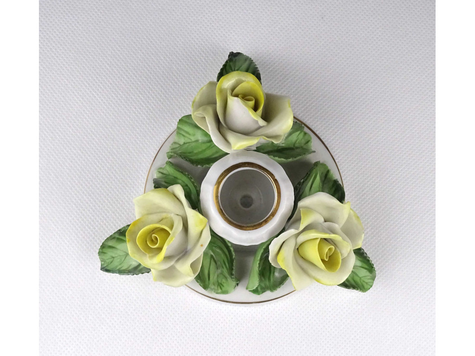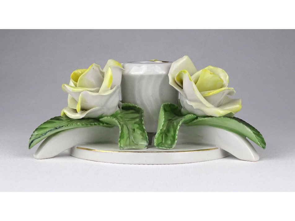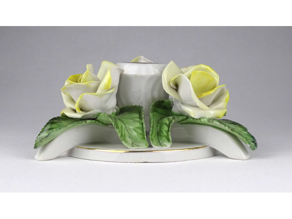 Szép állapotú, Herendi porcelán gyertyatartó három plasztikus sárga rózsával díszítve. A rózsák szirmai és levelei restaurátor által szakszerűen javítottak.